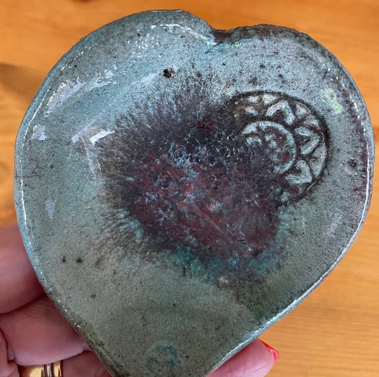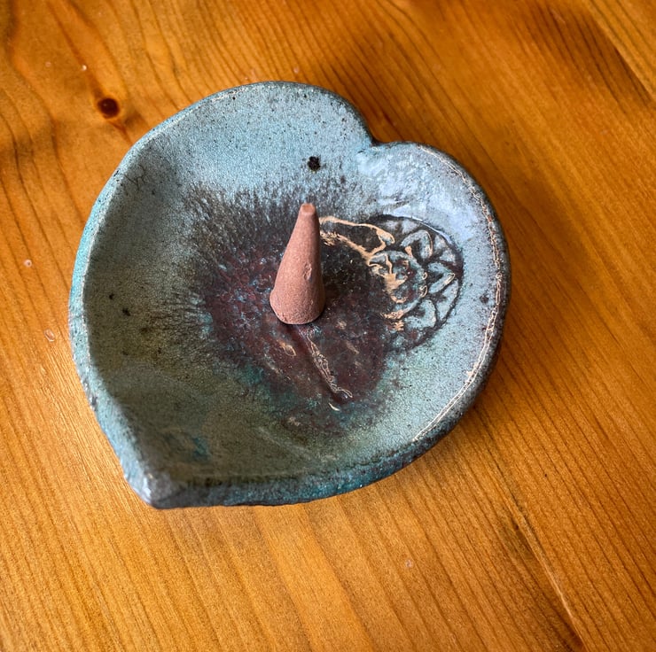 This is my raku heart-shape pale aqua with hues of copper ring dish embossed with a mandala. It can also be used as an incense cone burner.