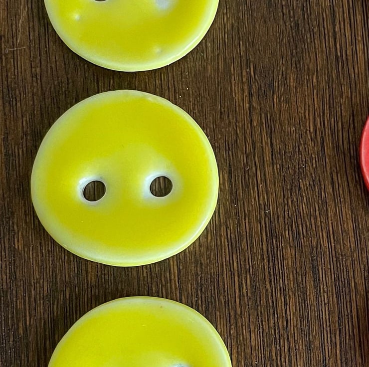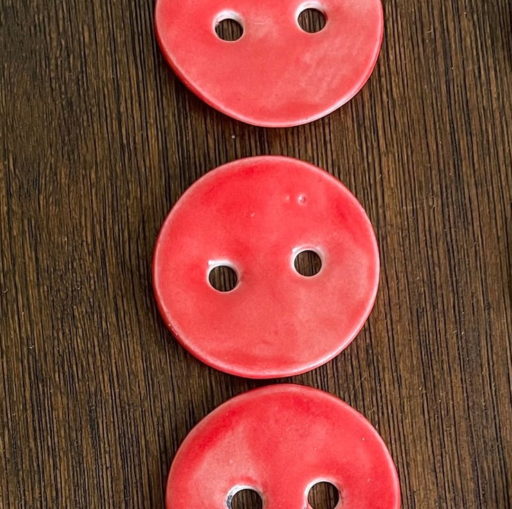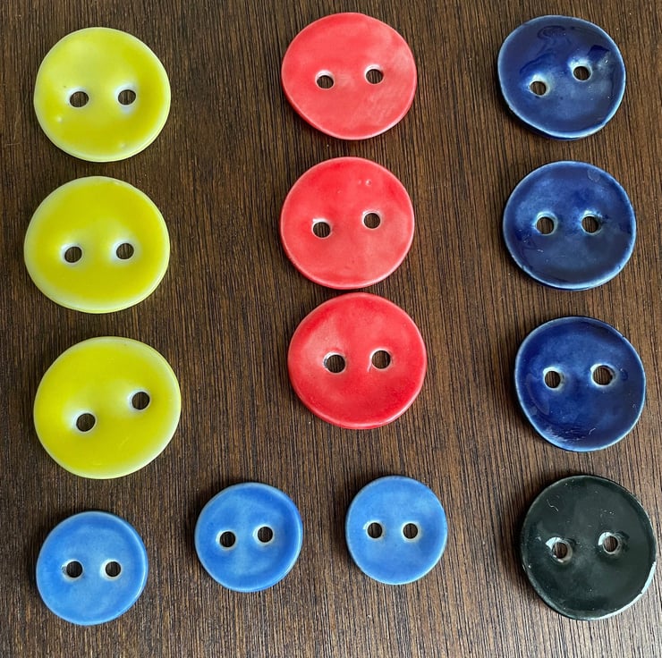 These handcrafted buttons are made using porcelain clay and hand-painted with glaze colours in bright red, sunshine yellow, pale blue, midnight blue and black.