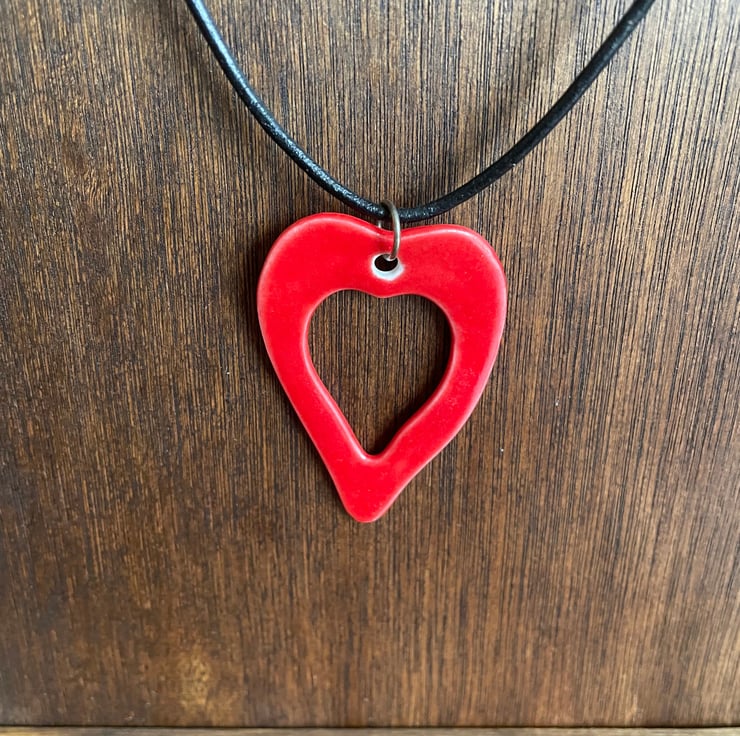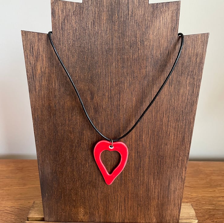 Red heart-shaped - medium: 5.2 cm H x 3.7 cm W: Black leather cord length - 48 cm with 7.5 cm extension chain