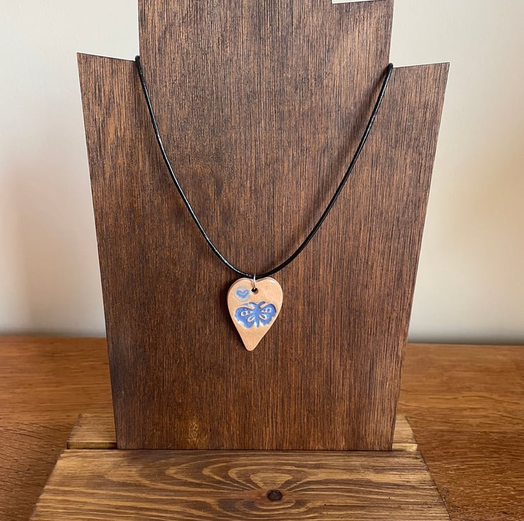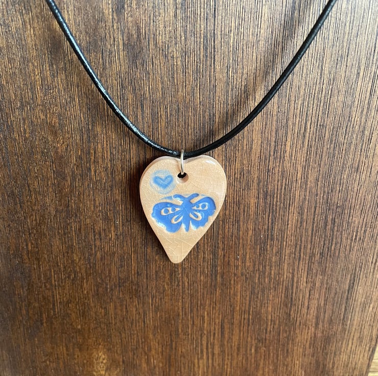 This handmade ceramic heart-shaped pendant is embossed with a blue butterfly has been handcrafted and hand-painted with a sky blue glaze; finished with a clear glass sheen.