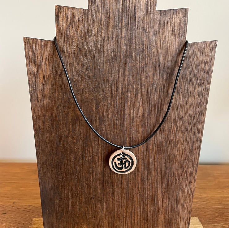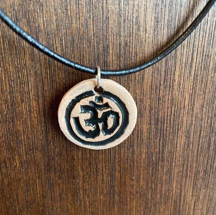 This handmade Ohm symbol unisex ceramic pendant has been embossed and hand-painted with black glaze.
