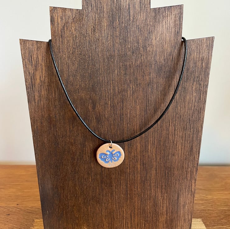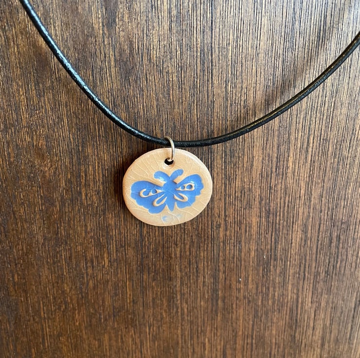 This handmade ceramic round pendant is embossed with a blue butterfly has been handcrafted and hand-painted with a sky blue glaze; finished with a clear glass sheen.