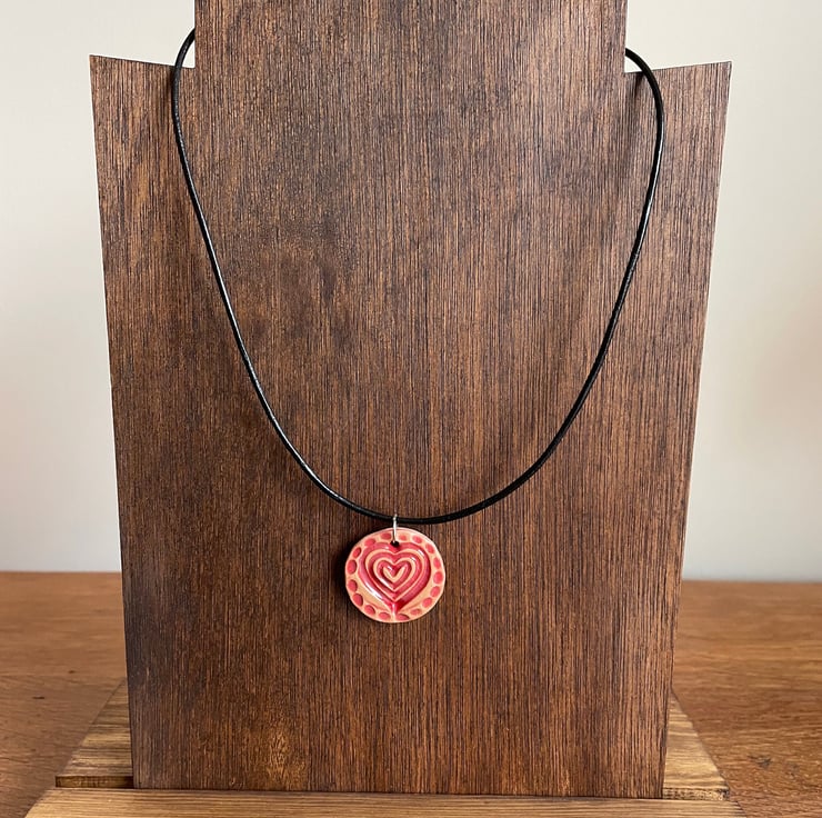 This handmade ceramic round pendant is embossed with hearts has been handcrafted and hand-painted with a red glaze; finished with a clear glass sheen.
