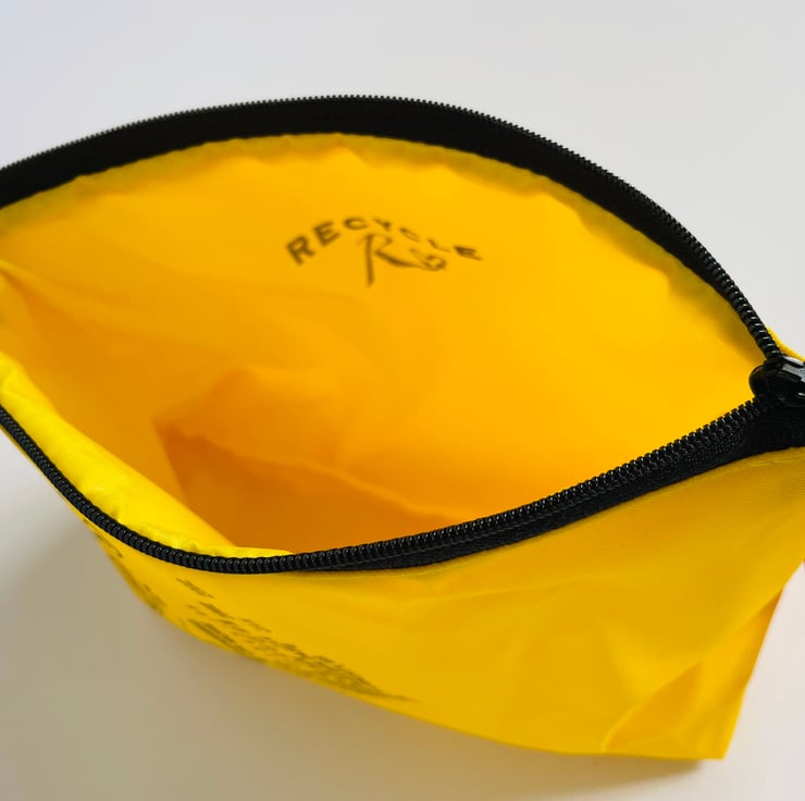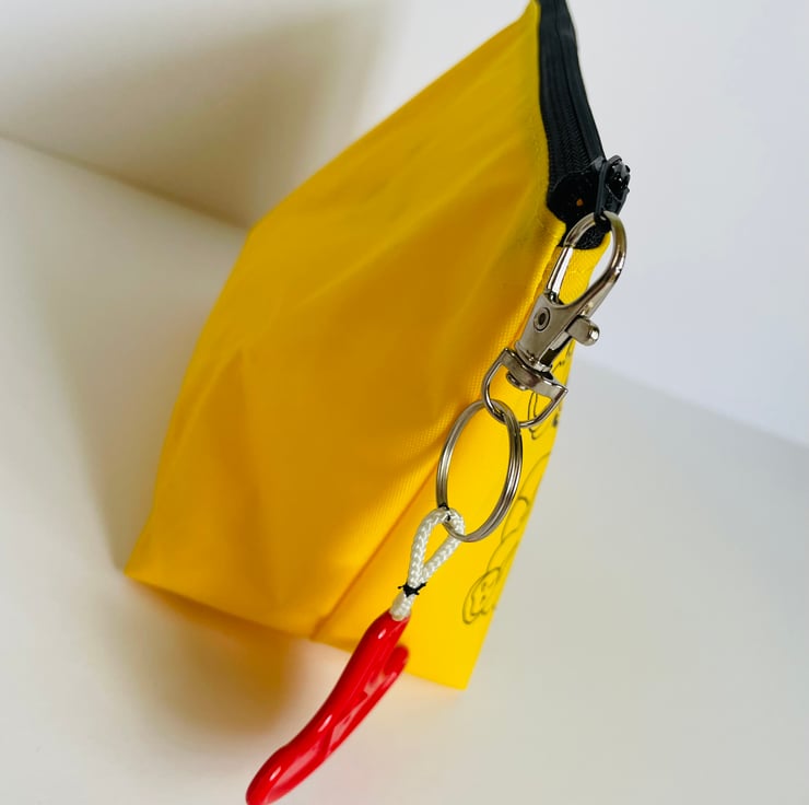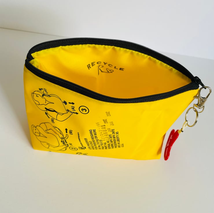 This pouch is made from genuine aircraft life vests and lined with yellow ripstop fabric. It fastens with a zip and has a red “jerk to inflate” toggle keyring.