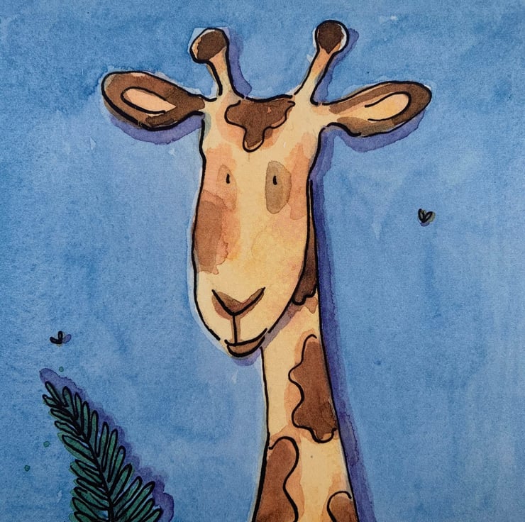 A colourful and cheery giraffe for all occasions. A great birthday card or just say Hello! A 15 x 15cm card with envelope, blank inside for your own message.