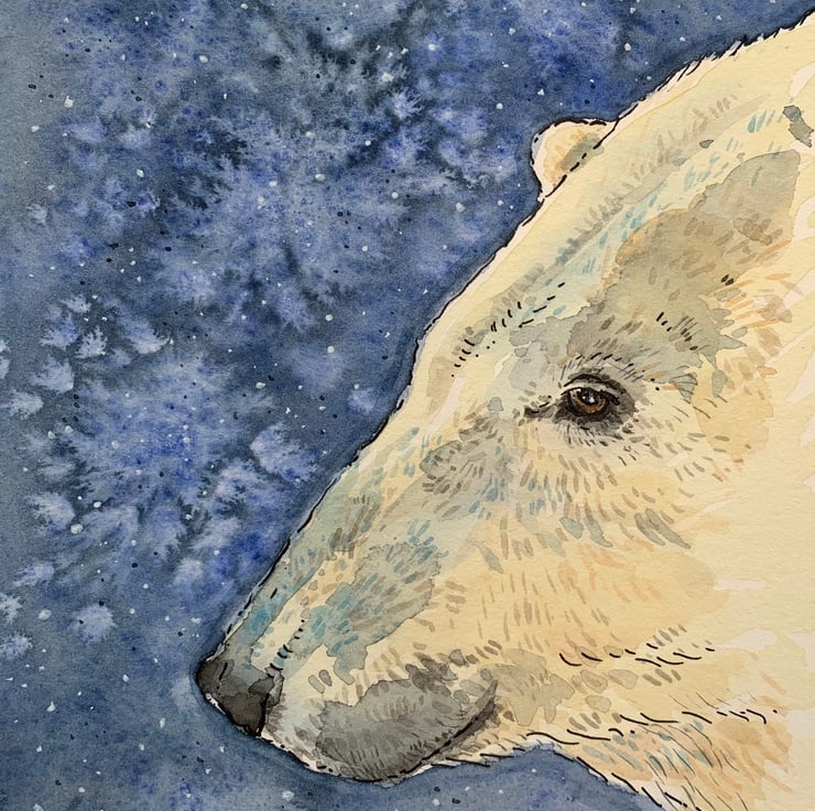 A square 14.5 x 14.5 Cute Christmas card with a Polar Bear. Painted with watercolour and drawn with ink and dip pen. I used salt on wet watercolour to make the crystallised effect in the background. A lovely heavy weight card, blank inside for your own message. Envelope included.