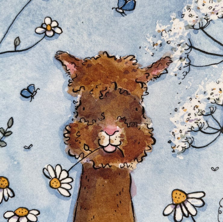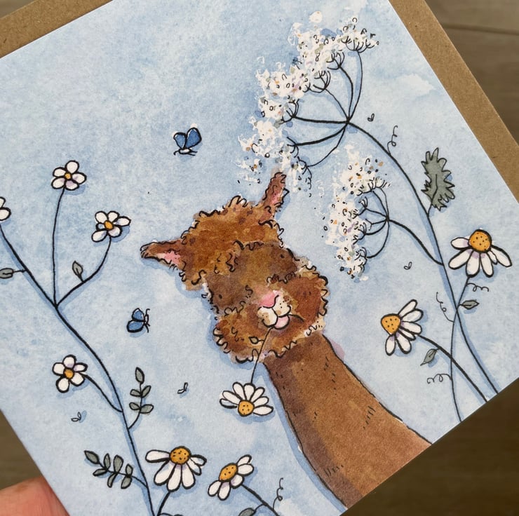 A watercolour painting of a friendly and cute Alpaca. he's called Pat and loves to be patted! painted by hand, by me. Great as a birthday card or just as a note to keep in touch. 14.5 x 14.5 cm card plus an eco recycled envelope. Blank inside for your own message.