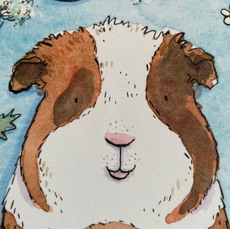 A watercolour painting of a friendly and cute Guinea Pig. She's called Roxie and she ROCKS! painted by hand, by me. Great as a birthday card or just as a note to keep in touch. 14.5 x 14.5 cm card plus an eco recycled envelope. Blank inside for your own message.