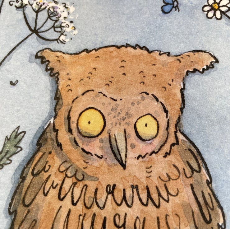 A watercolour painting of a friendly and cute Owl. he's called Howard and contrary to popular belief, sleeps at night and plays all day! painted by hand, by me. Great as a birthday card or just as a note to keep in touch. 14.5 x 14.5 cm card plus an eco recycled envelope. Blank inside for your own message.