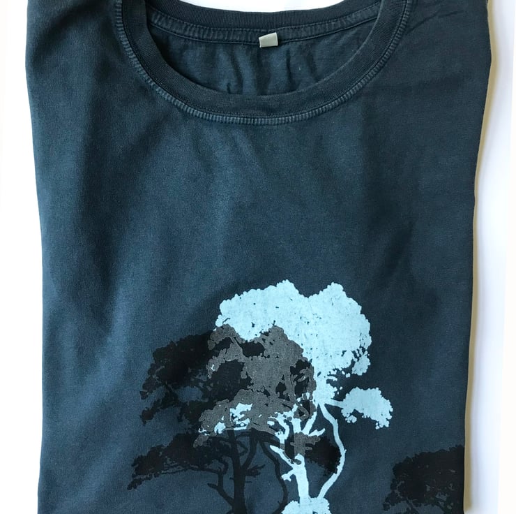 Denim blue , light blue, black, dark grey print of pine trees