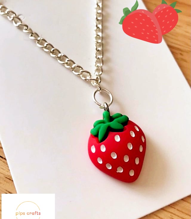 Fun strawberry pendant on a silver plated 18 inch chain with clasp fastening.
