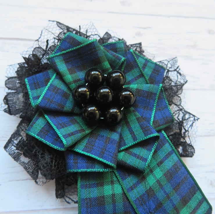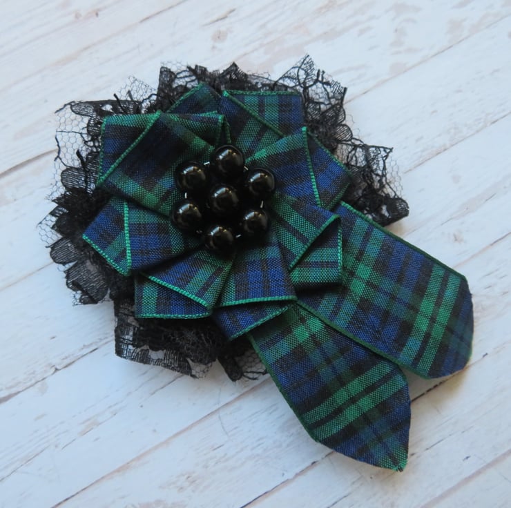 Black Watch Tartan Plaid Ribbon Ruffle Lace Rosette Celtic Brooch Corsage Pin