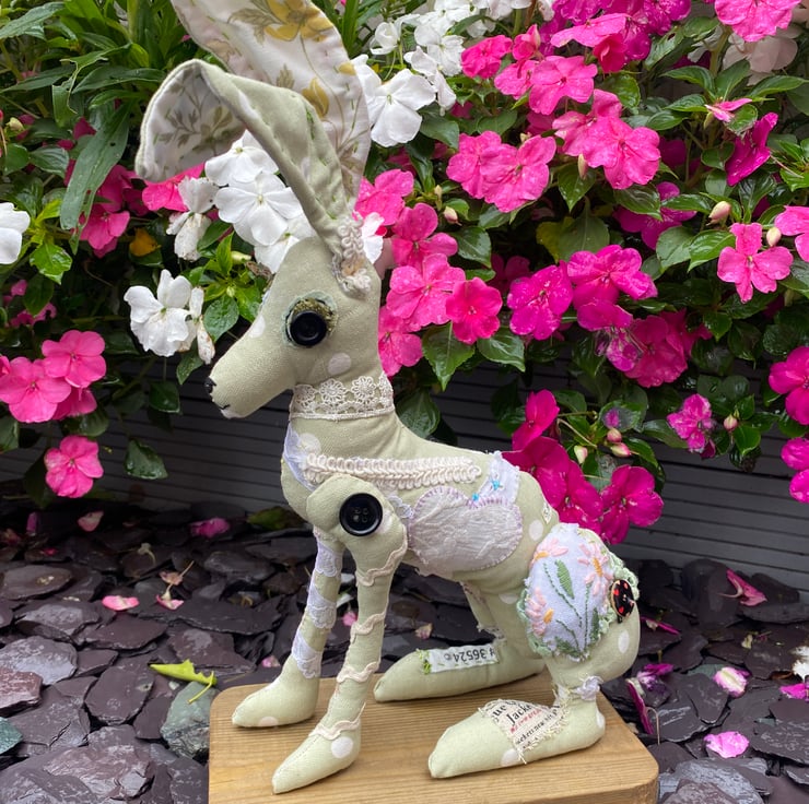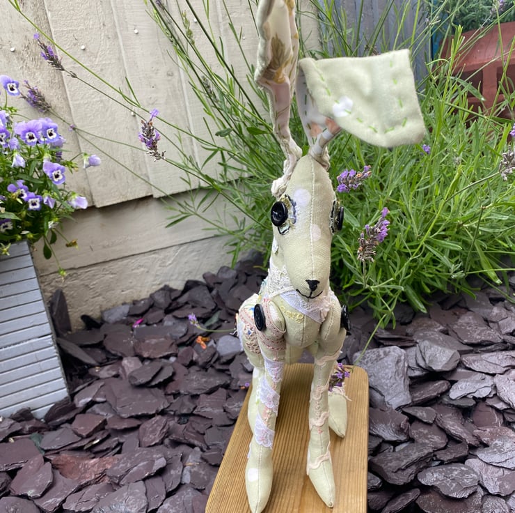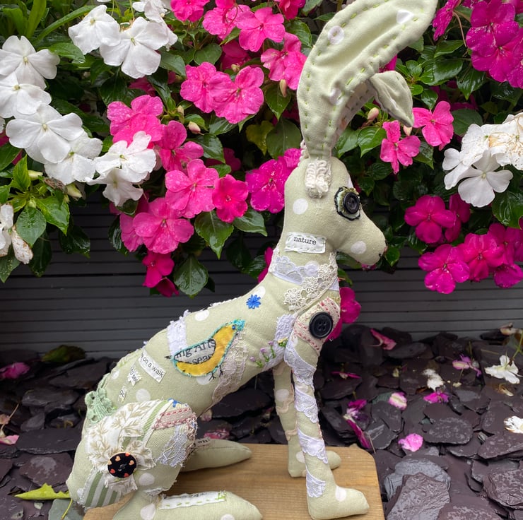 The most delightful soft sculpture hair, made from a sage green, spotty soft furnishing fabric. The inner ears are made from a vintage tablecloth.