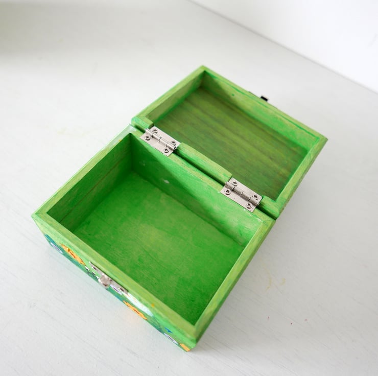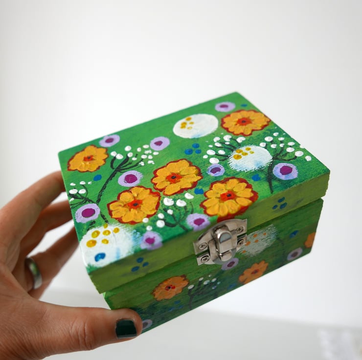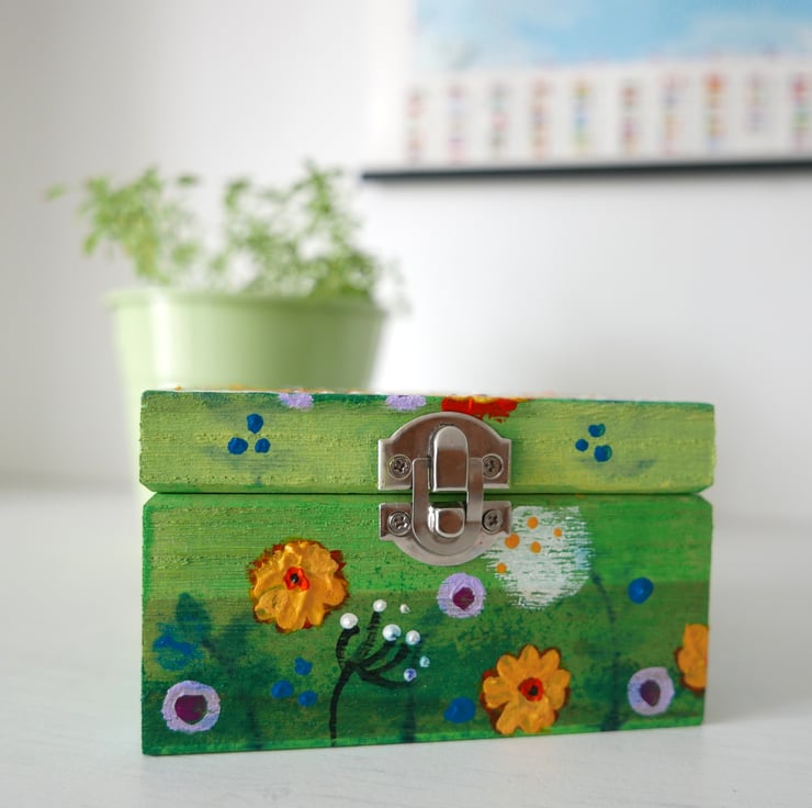 This trinket box is hand-painted by me with acrylic paints featuring a meadow pattern against a green background. The box looks like a mini painting and it's the perfect gift for someone who has everything or it's difficult to buy for. The box measures approx 4.75" x 3.75" and 2.75" high. It is varnished for protection and painted inside.
