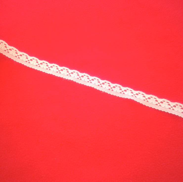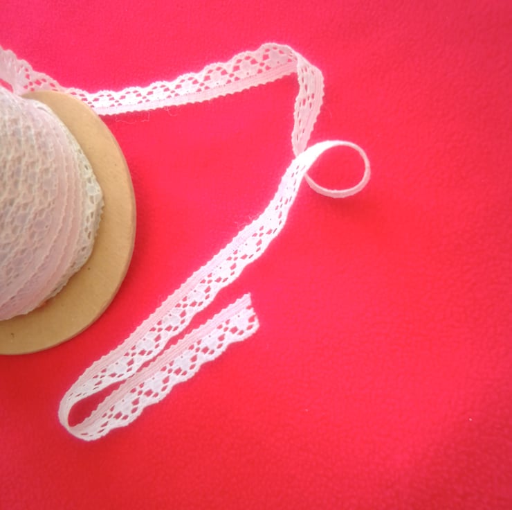 An almost Full Reel of Vintage White Nylon Lace Trim, perfect for dressmaking or crafting projects. Full reel held 111 meters. Lace is 0.5 inches (1 cm) wide.
