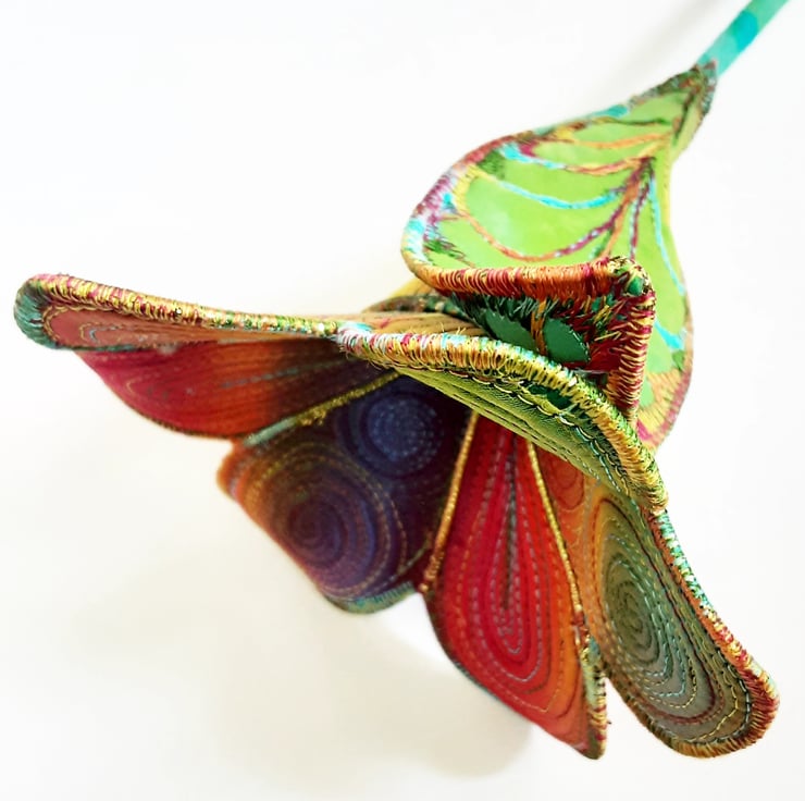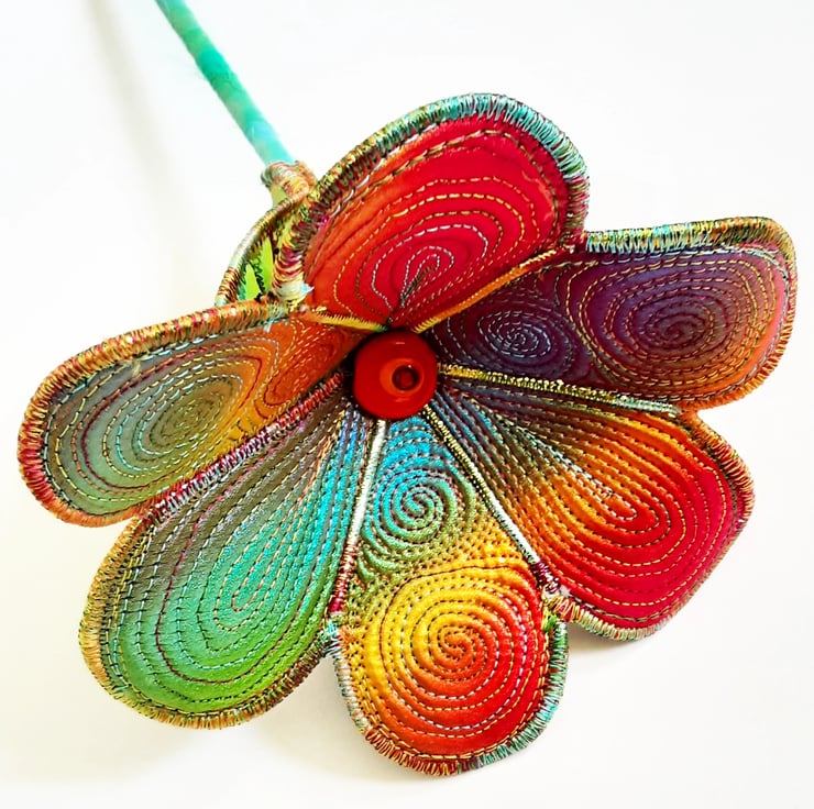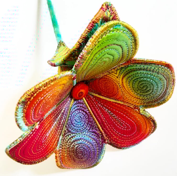 Made from layers of fabric including hand dyed Egyptian cotton and silk fabrics using the free machine embroidery style of sewing