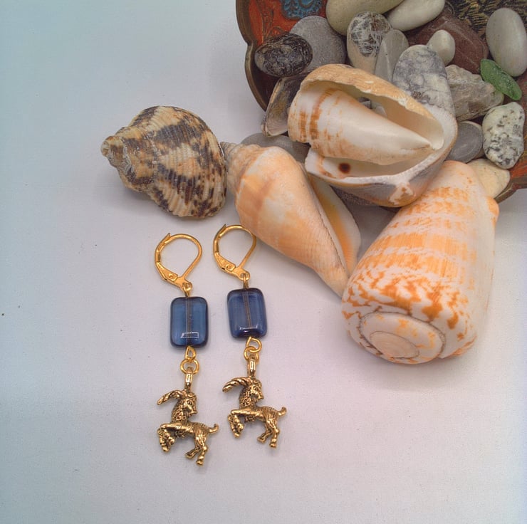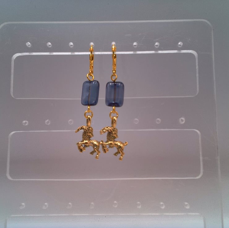 These gorgeous deep navy blue glass rectangle and goat charm dropper earrings go well with any outfit you wear everyday or for an evening out. They would make a lovely gift for a Capricorn friend or relative for a birthday, an anniversary, or a treat for yourself. They are made using a 10 mm x 8 mm navy glass rectangular bead and a 15 mm x 15 mm gold plated goat charm. They are suspended on gold plated lever back ear wires with a drop of 4.5 cm from the base of the ear wire. The earrings will be dispatched wrapped in tissue paper in an organza bag and delivered to you via Royal Mail first class post.