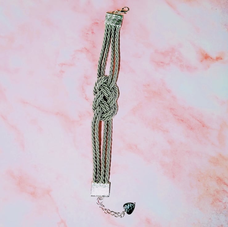 A silky soft decorative twisted cord bracelet tied with a double corded nautical sheet knot to the centre. Finished with textured silver tone folded metal and silver plated lobster claw clasp and extender chain with a beautiful black Hematite Gemstone heart charm.