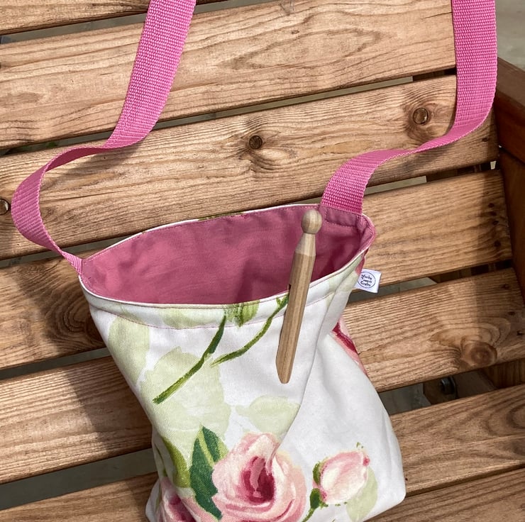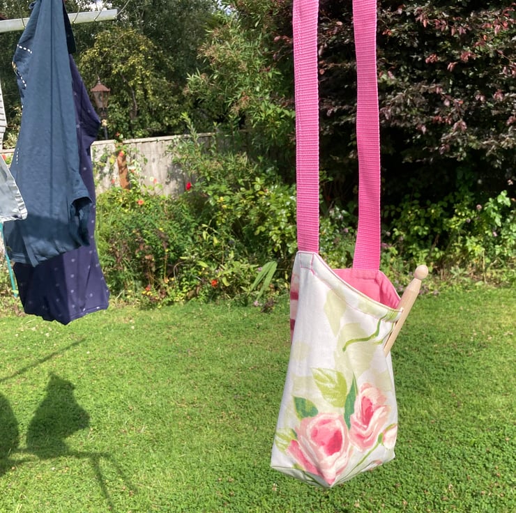 If you’re looking for a handy peg bag with a difference this may be the one for you. This bag is made from a pretty cotton decorated with pink roses and is lined with plain pink polyester cotton. It has a strong, pink strap, long enough to be worn across your body.