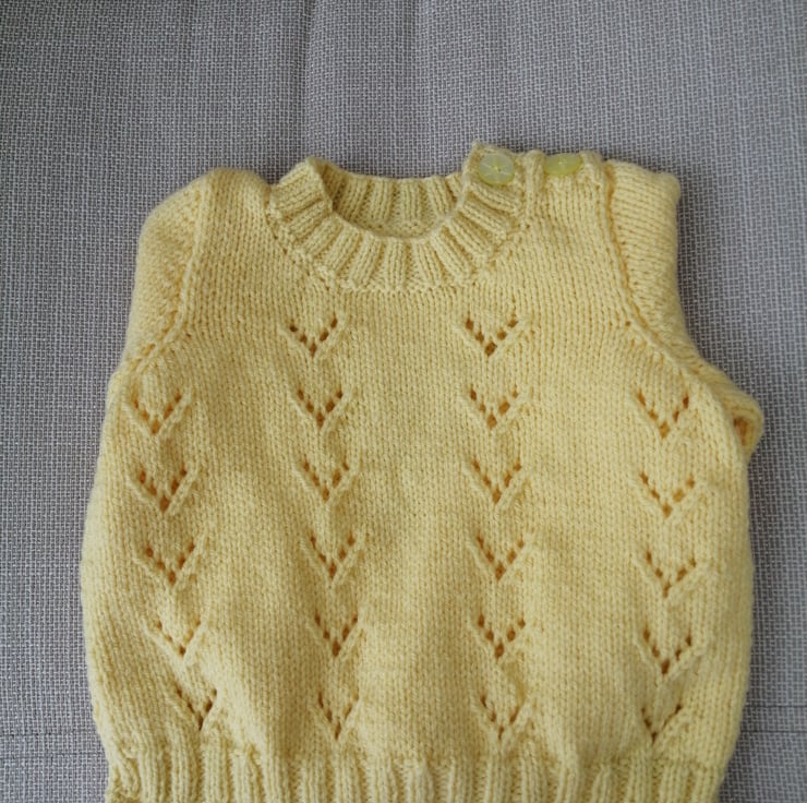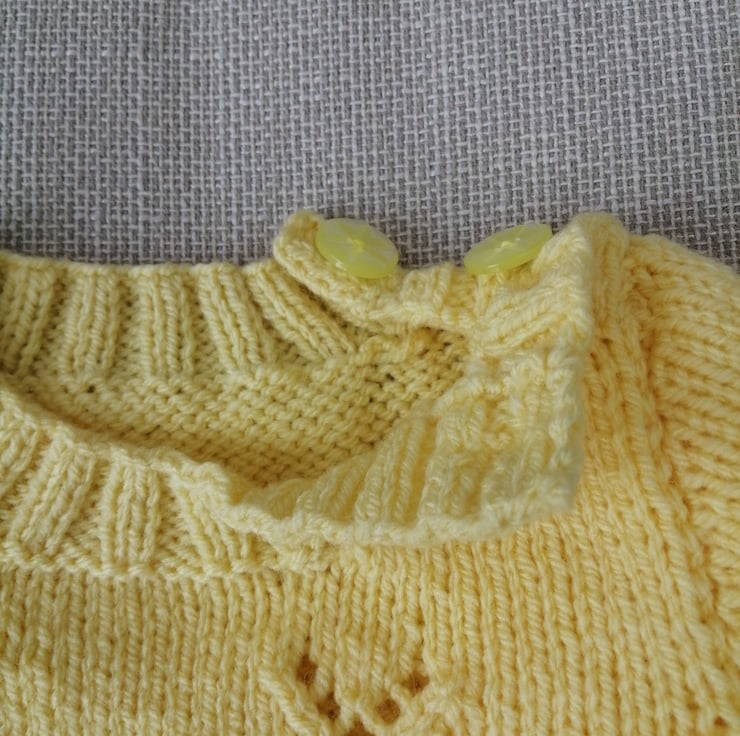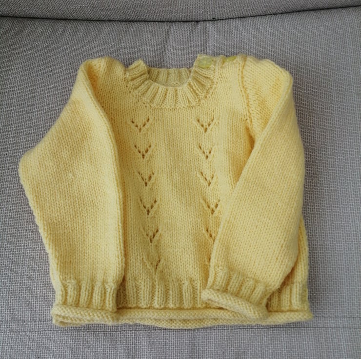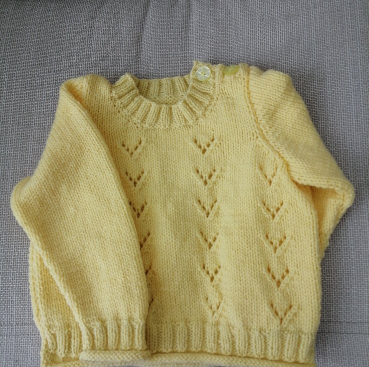Child's jumper with a pretty pattern on the front. It has a button opening on the shoulder for ease of dressing.