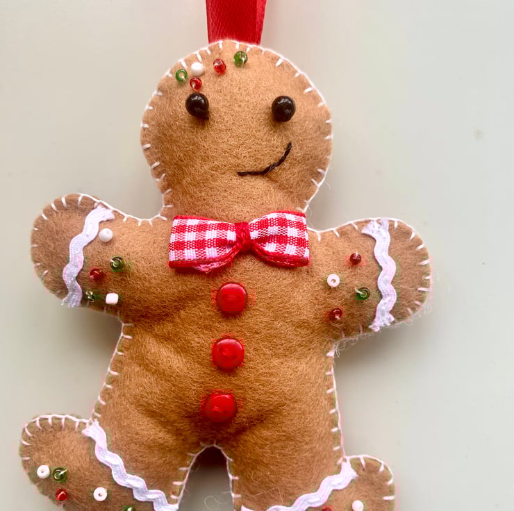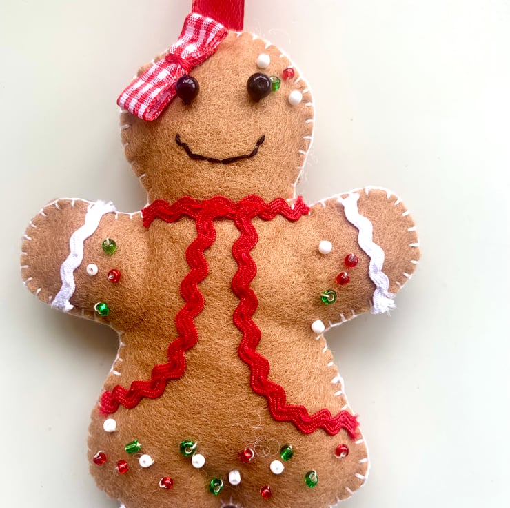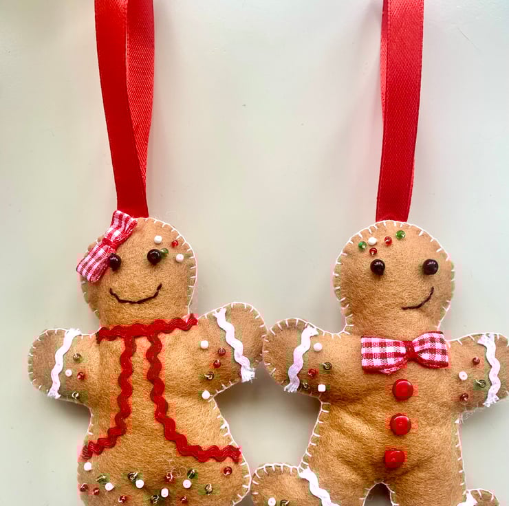 A cute felt gingerbread man and woman adorned with red, white and green glass seed beads completed with a red satin hanging ribbon. Approximately 11cm in height with a 10 cm ribbon. Stuffed lightly with toy filling.