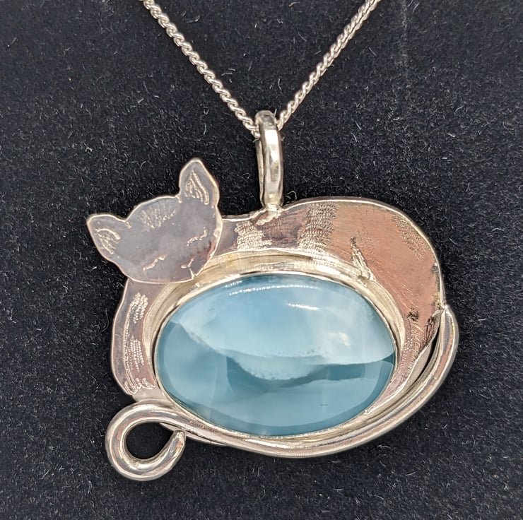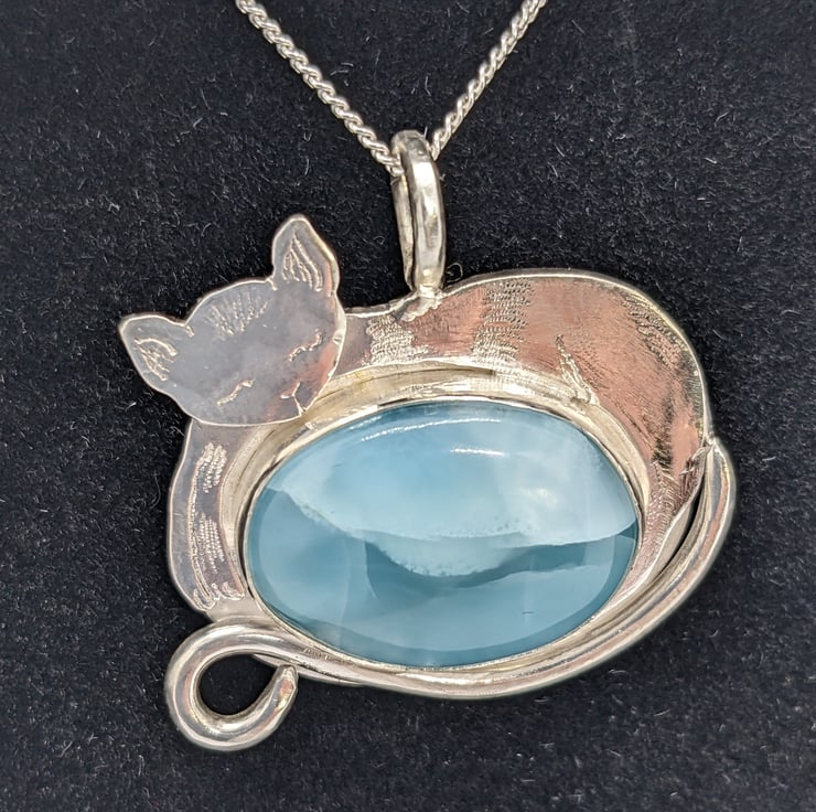 This hallmarked, sterling silver 'sleepy cat' pendant is completely handcrafted. I have hand drawn and saw pierced the cat to sleep soundly, draped over this beautiful bezel set, sky blue Larimar stone. The cat's silver tail also curls around the stone and I have engraved the cat's face with its sleeping features. The pendant comes with a 1.2mm, diamond cut, recycled sterling silver chain. It is presented in a black cardboard box, as shown in the photographs. A perfect gift for anyone who loves and admires cats!