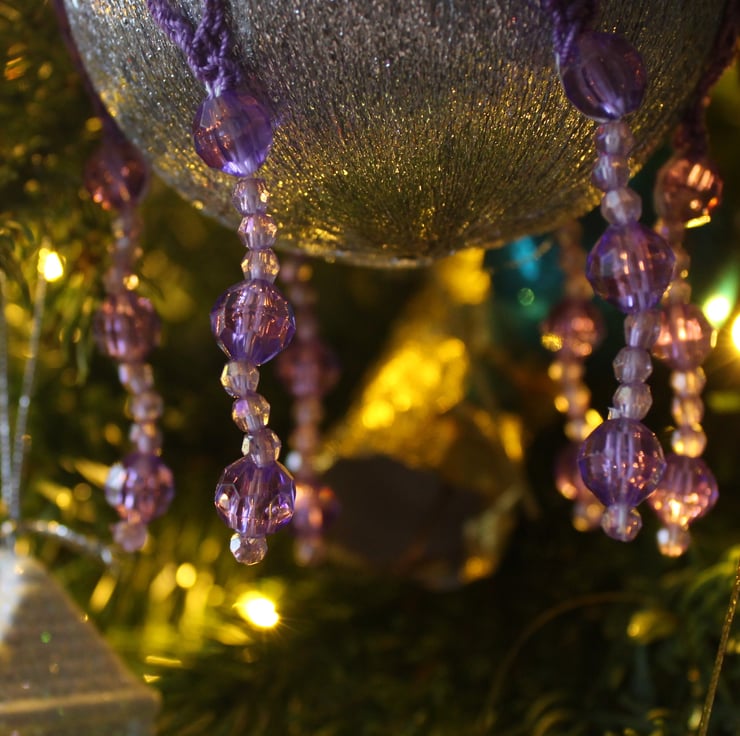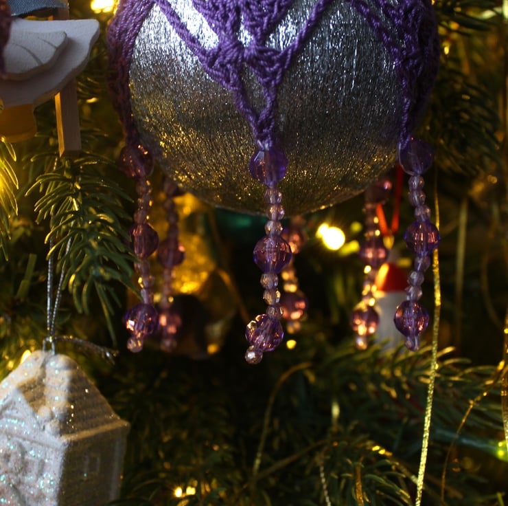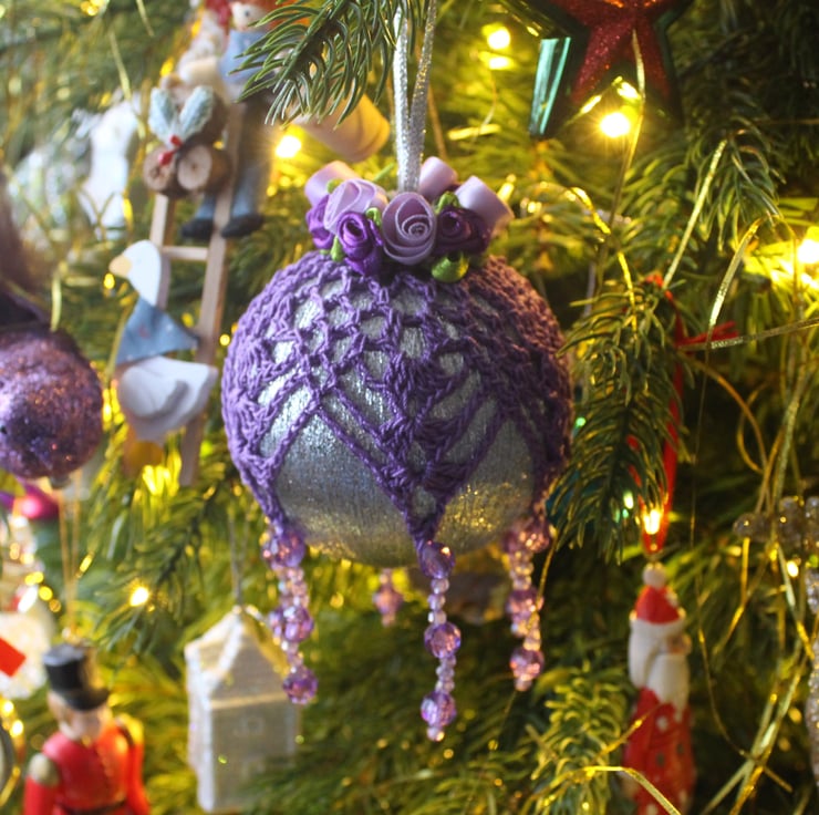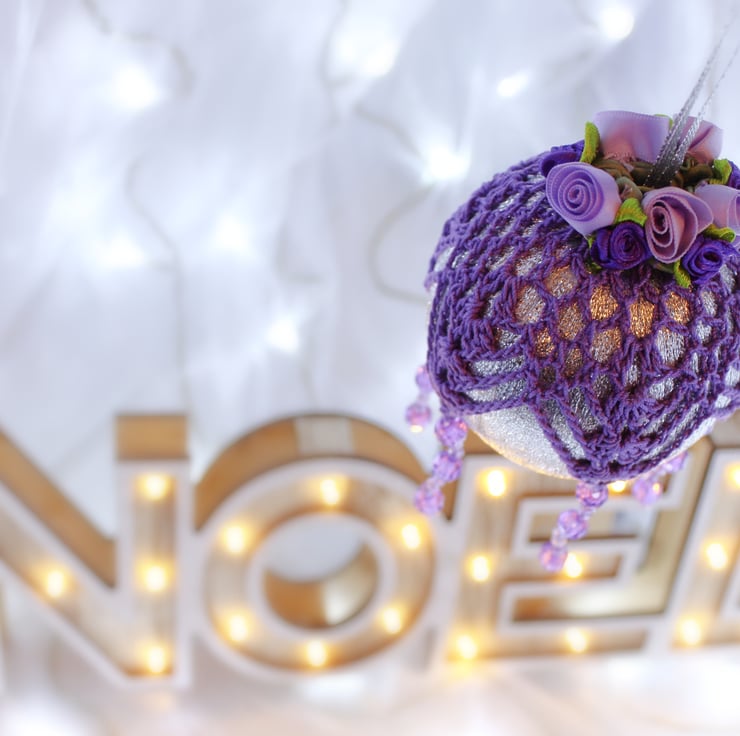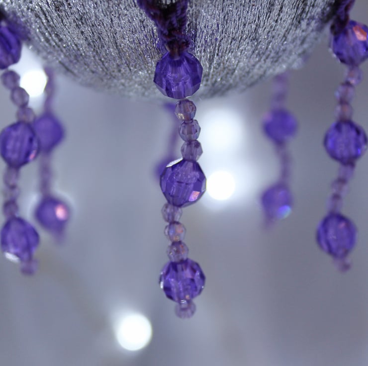 Discover the charm of this exquisite silver-coloured thread bauble, beautifully enhanced with intricate hand-crocheted purple lace. Topped with elegant purple and lilac satin roses, it features vibrant purple and lilac multi-faceted acrylic beads cascading from the lace points—an enchanting addition to your Christmas tree!