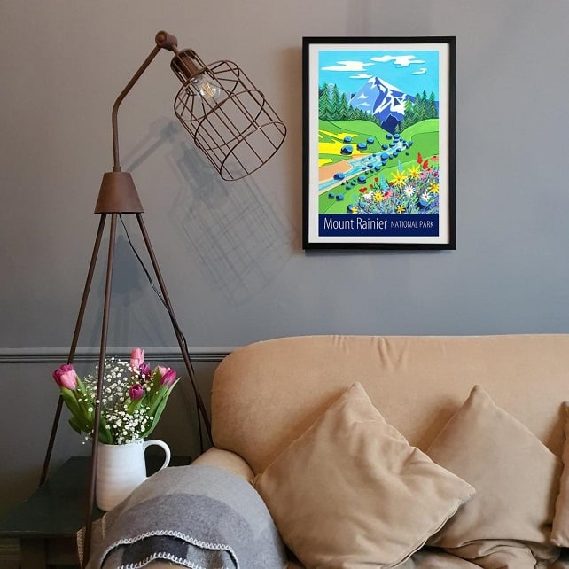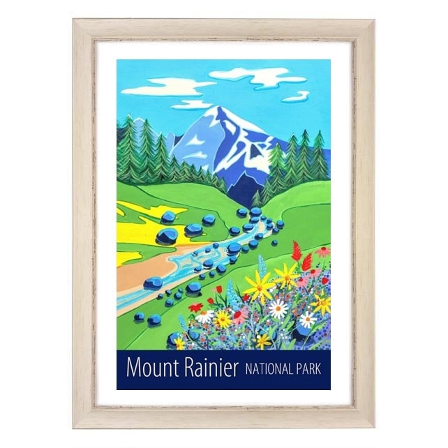 A contemporary travel poster print of Mount Rainier National Park in Washington State, USA, from my own original acrylic painting, created for one of the projects in my "Passport to Painting" book (Published by Search Press).