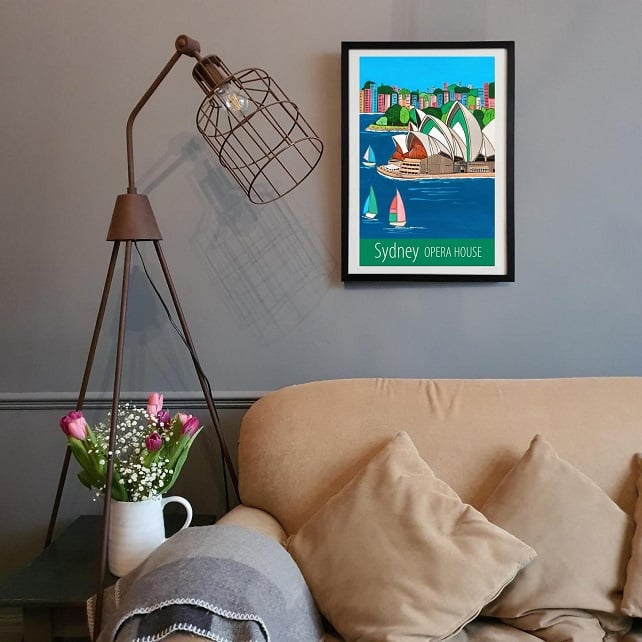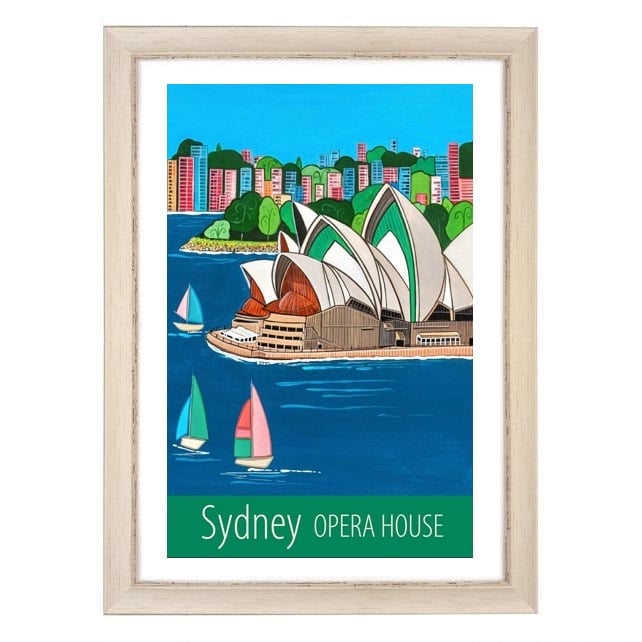A contemporary travel poster print of Sydney Opera House, from my own original acrylic painting, created for one of the projects in my "Passport to Painting" book (Published by Search Press).