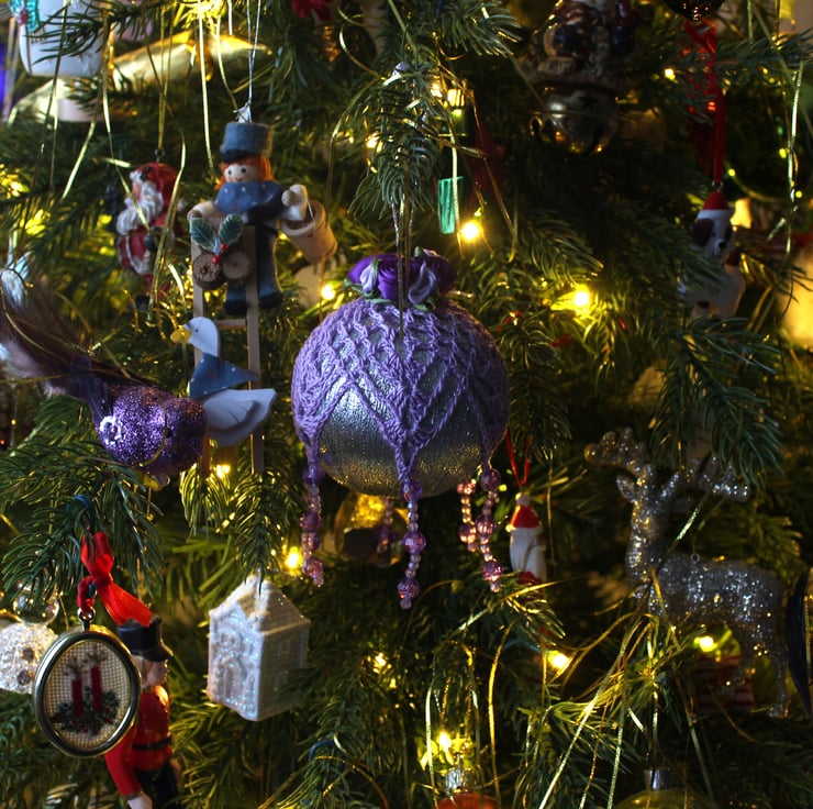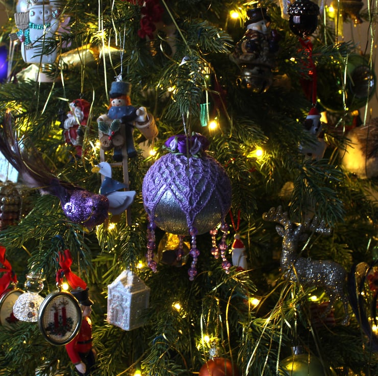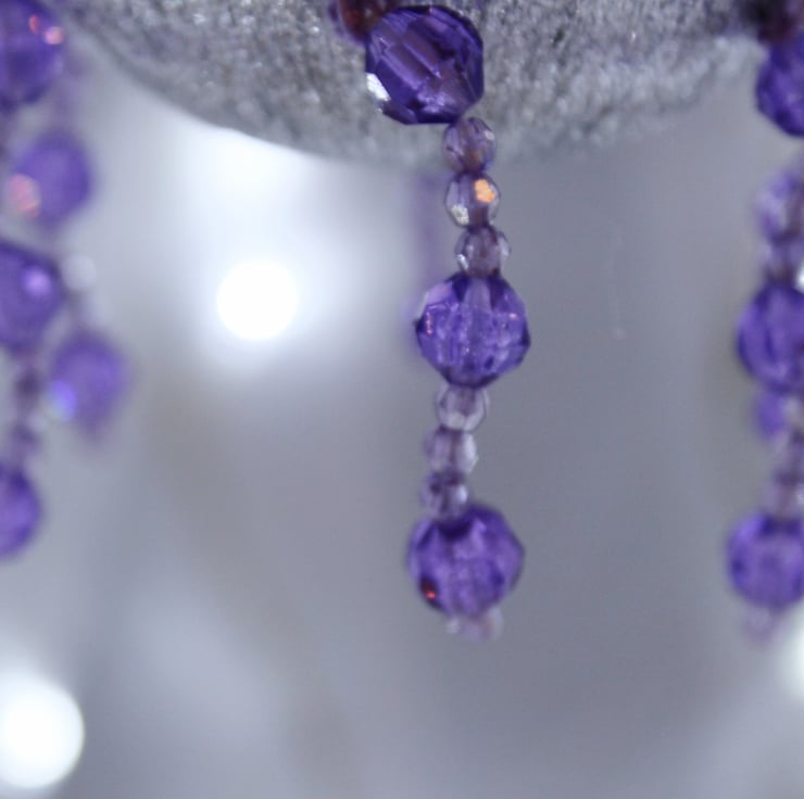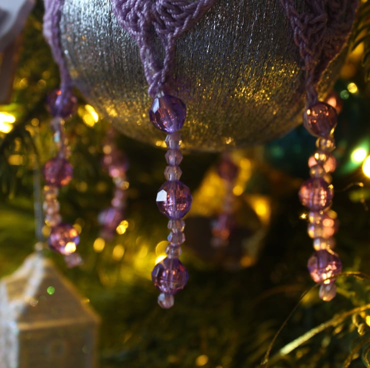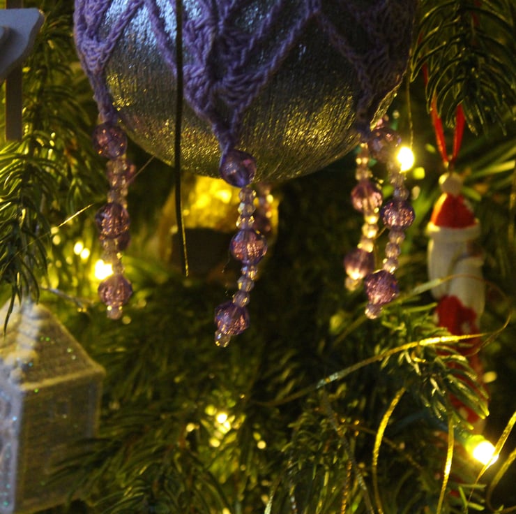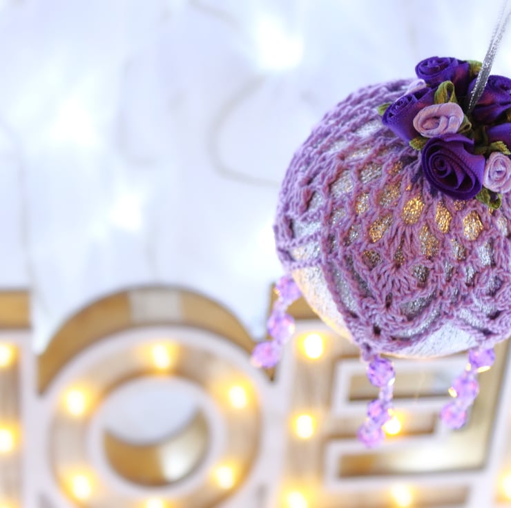 Discover the charm of this exquisite silver-coloured thread bauble, beautifully enhanced with intricate hand-crocheted lilac lace. Topped with elegant purple and lilac satin roses, it features vibrant purple and lilac multi-faceted acrylic beads cascading from the lace points—an enchanting addition to your Christmas tree!