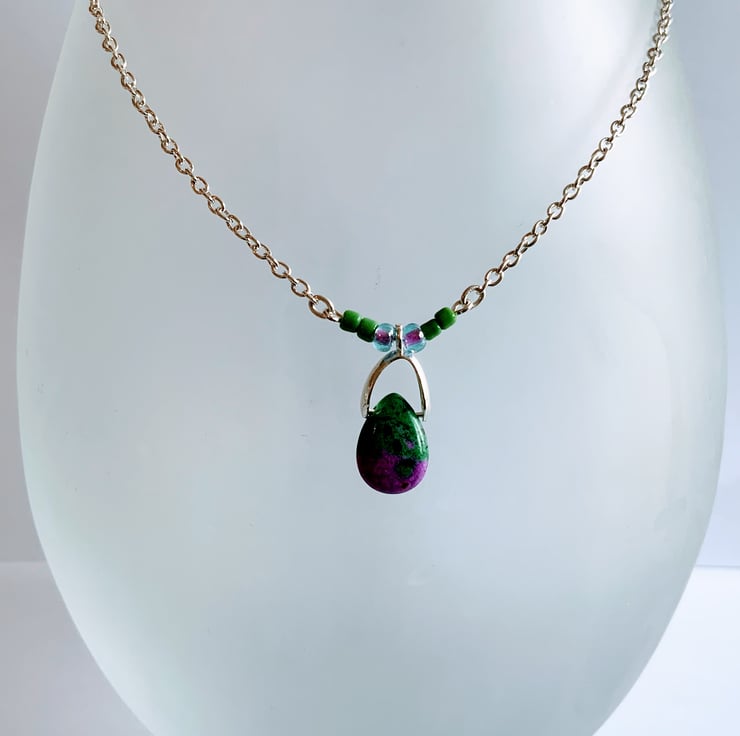 Centred between mini rochelles in complementary colours. Hanging on an 18 inch silver plate cable chain lead and nickel free and rust resistant with a beautiful sparkle. There is an added chain extension so you can ajust the length if desired.