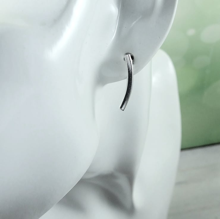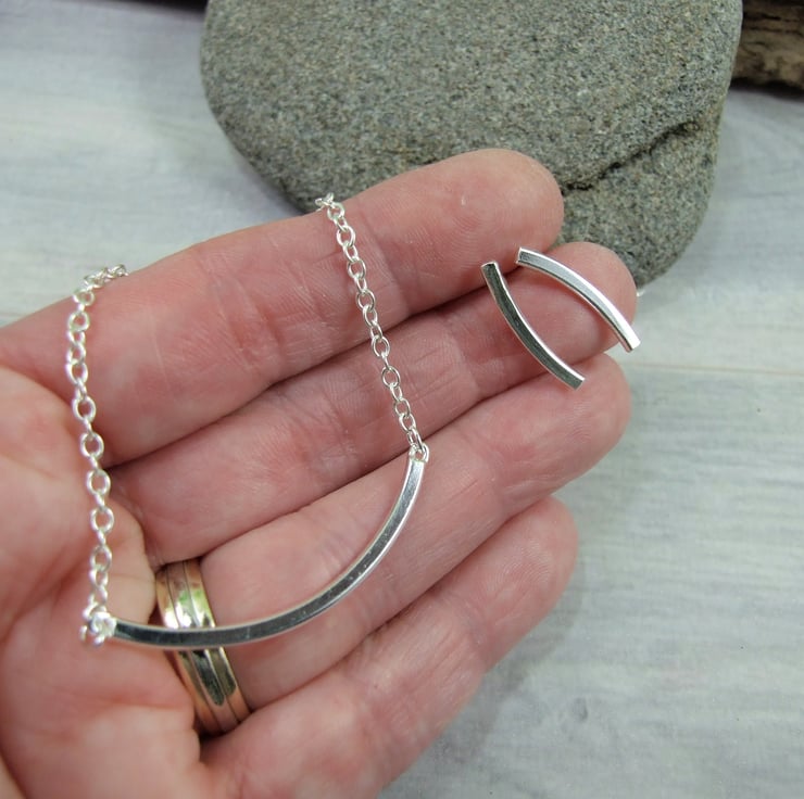 I have created the curved bars from silver wire that I have shaped into square wire then curved I have soldered on two small rings to fit an 18 inch chain to for the pendant. I have soldered .925 sterling silver posts to the two smaller curved bars for the earrings.