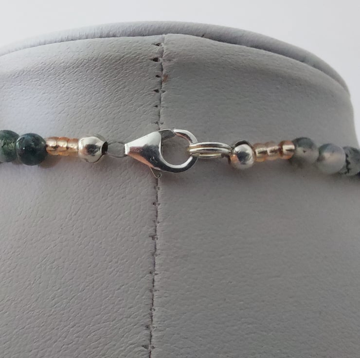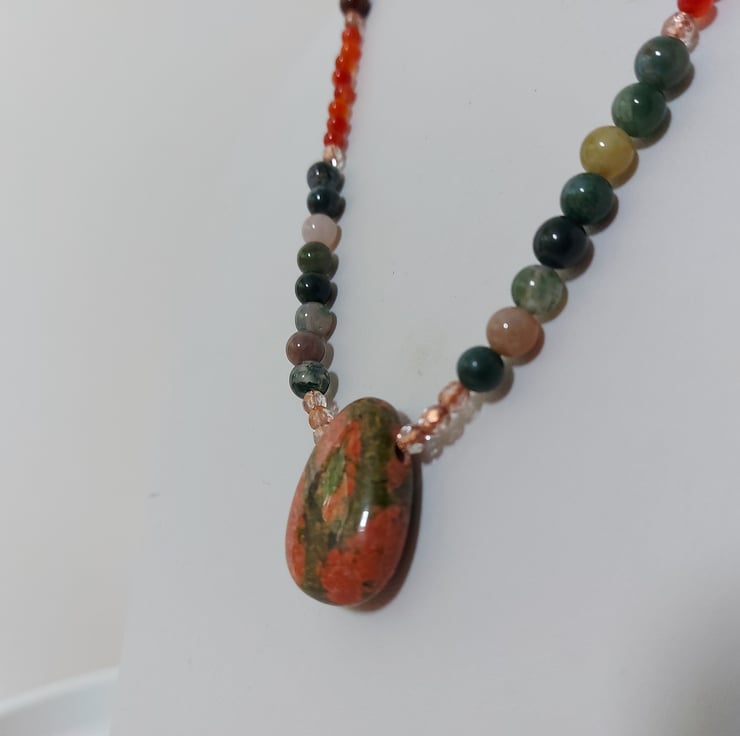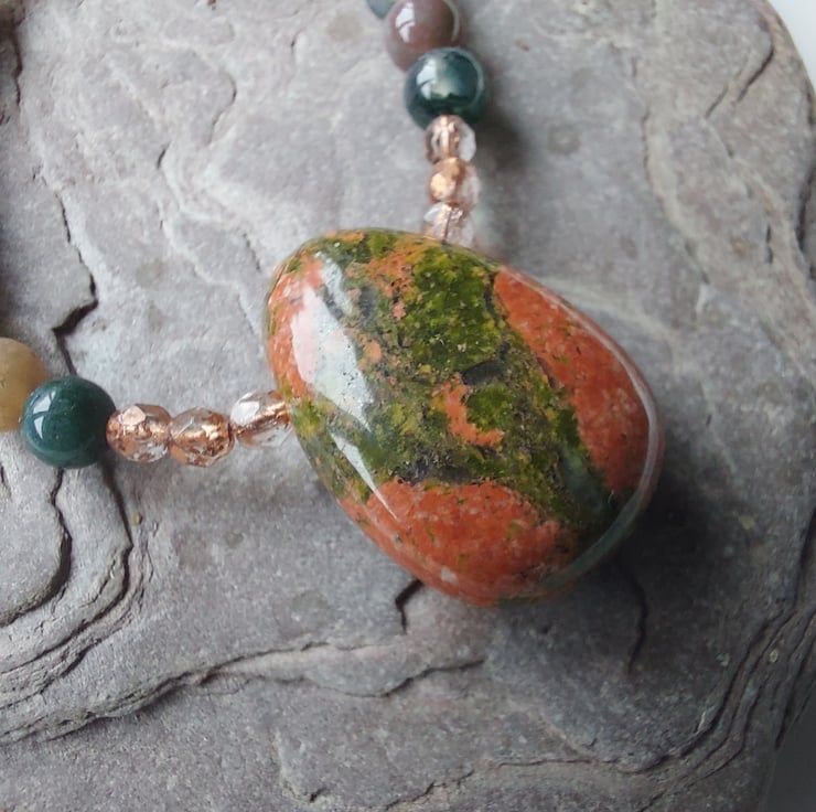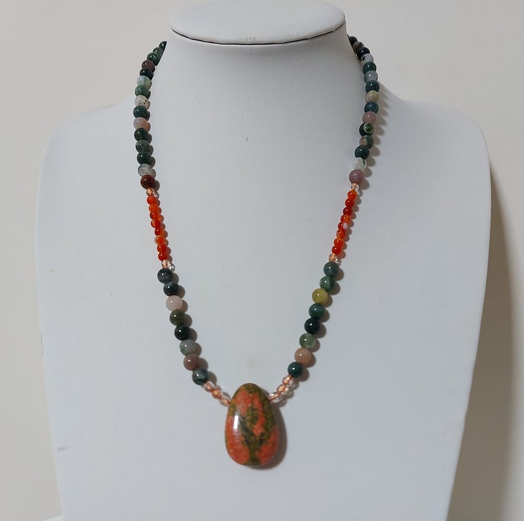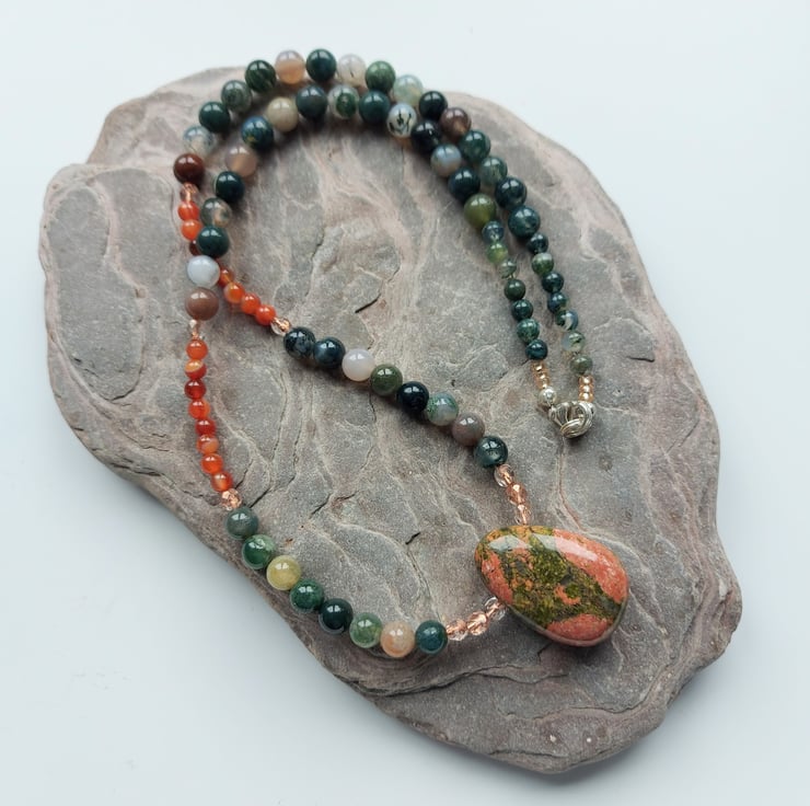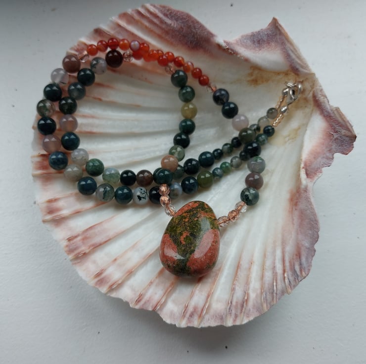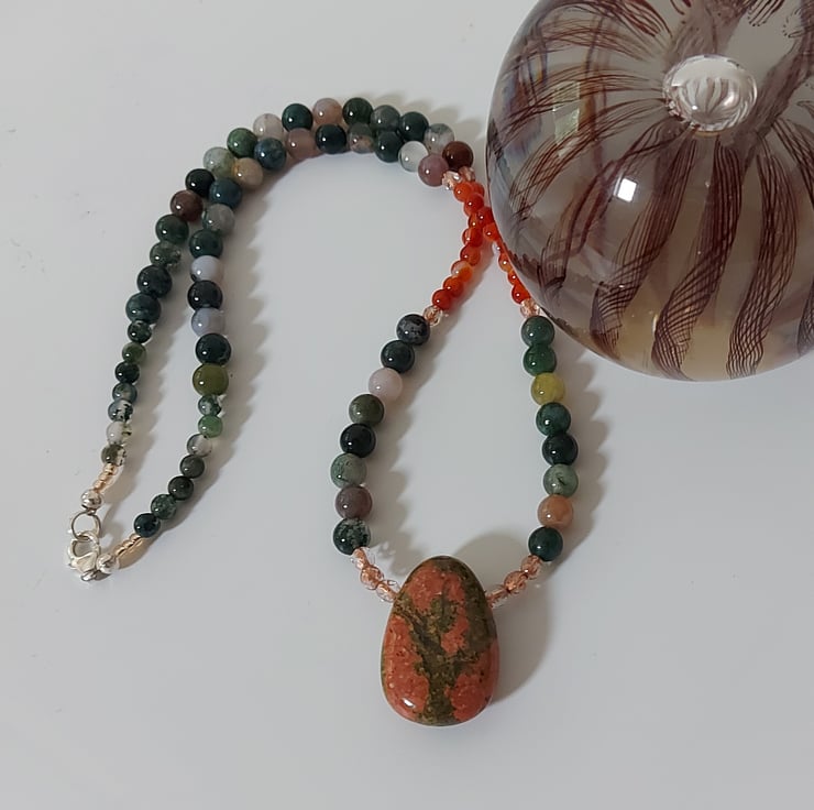 This lovely necklace displays a variety of semi-precious beads in glowing Autumn colours. The focal point is a unakite pendant combining shades of green and orange in a vibrant pattern which reminds me of a tree at sunset. 6mm beads of Indian agate, mainly green with shades of brown, are contrasted with stretches of orange-red carnelian, 4mm round beads. Copper-lined beads of Czech crystal add a touch of sparkle. A sterling silver trigger clasp completes the necklace.