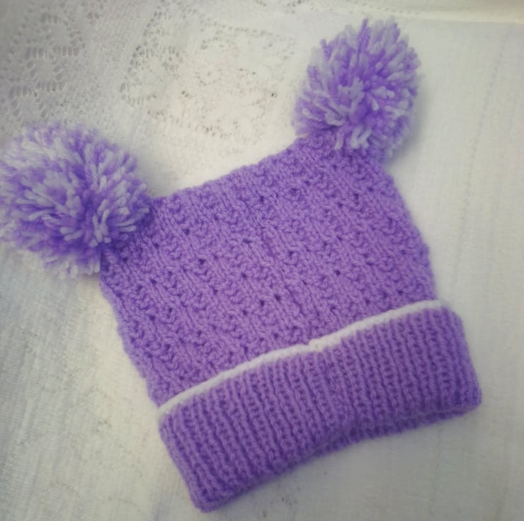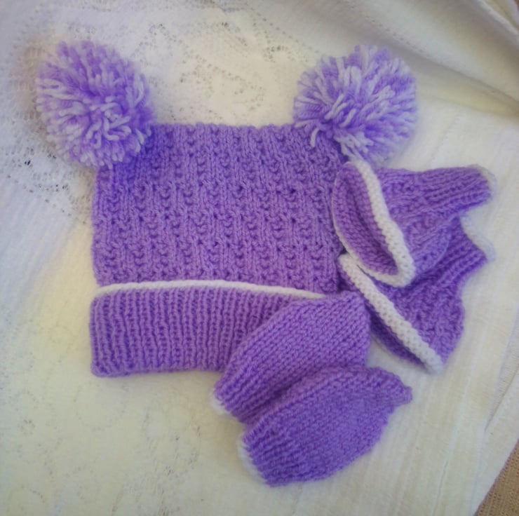 The hat, mittens and booties set would make an ideal gift for a baby shower, a new baby, for Christmas or as a Christening gift. It would also make a lovely gift for a new premature baby. The hand knitted set comprises a pom pom hat, a pair of mittens & a pair of booties.The set is in stock in the lilac colour with the white edging shown, to fit a newborn baby with a 14 inch chest. The hat has two fluffy lilac and white pom poms at the top corners.