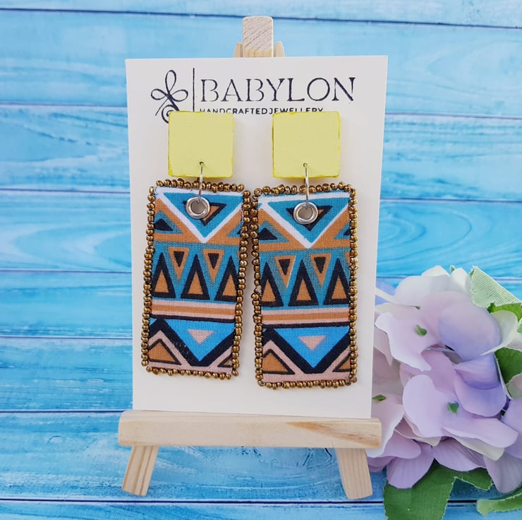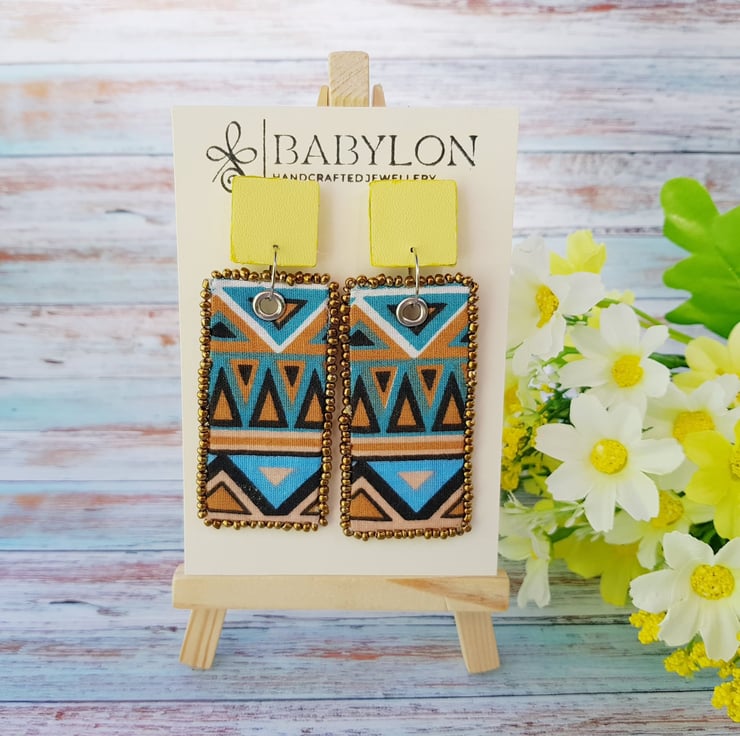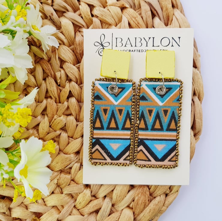 Handmade and rectangular shaped earrings with a tribal-style pattern with purple and yellow colour made from the finest cotton. The edges of these ethnic earrings are stitched with seed beads mixed with a yellow faux leather. The quantity of these earrings is only 2 pairs!