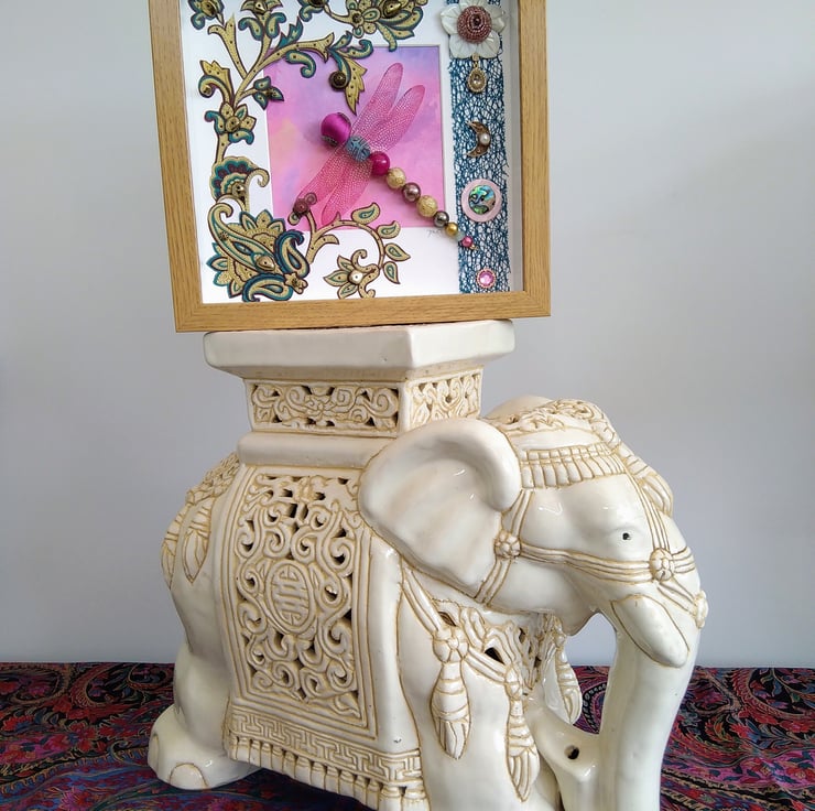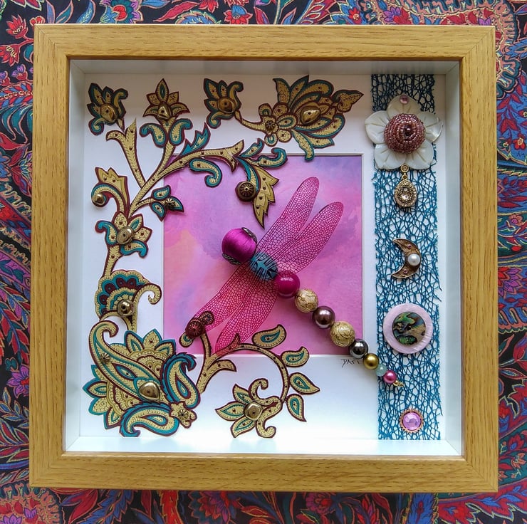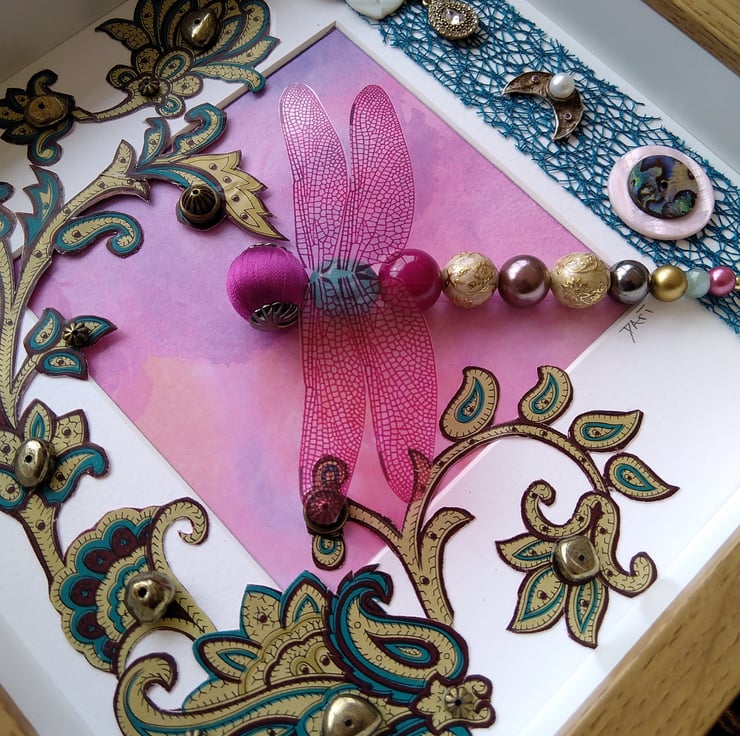 Hello and welcome! This page is home to Beaded Beasties: mixed media box frames of dragonflies and other creatures within an environment. Each one unique, made from new and recycled materials. I hope you love what you see.