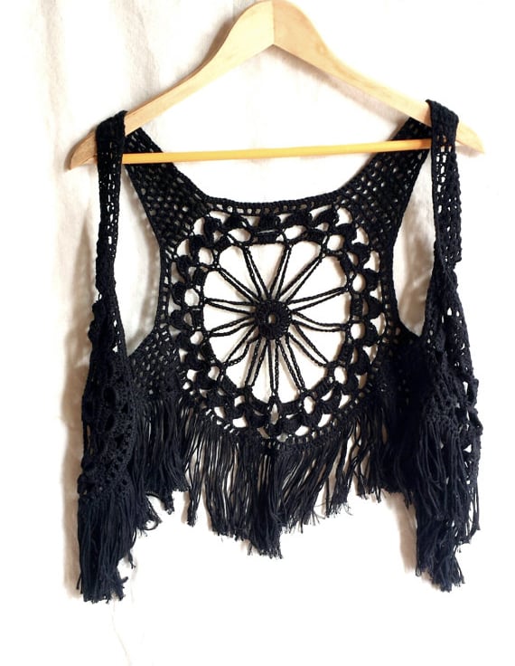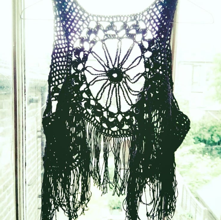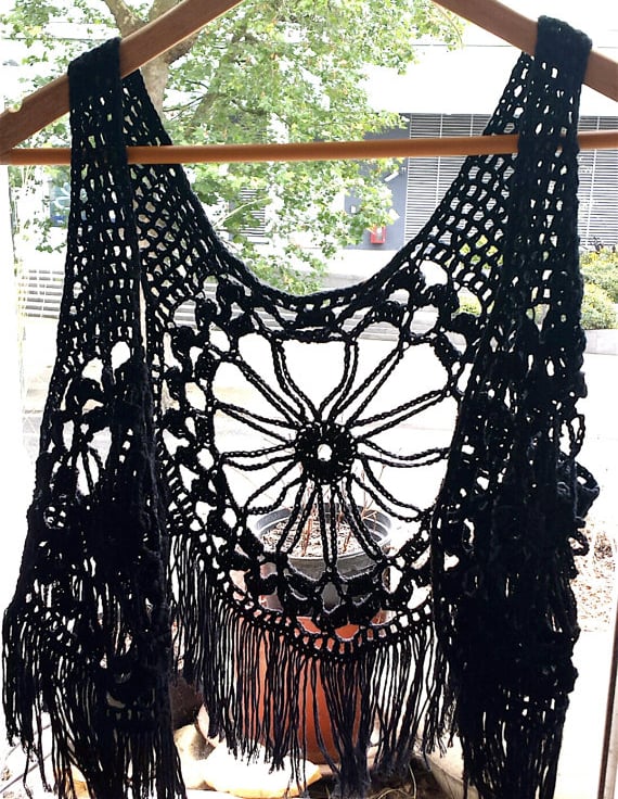 This crochet vest features a flower theme and has a generous fringe all around.Inspred by a vintage 70s pattern,it is made in a soft,strong black cotton,handmade with an eye for detail and finished with a fringe.Really flattering,it compliments most outfits and is great for parties,festivals and performances.
