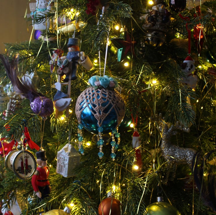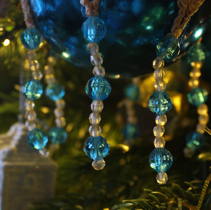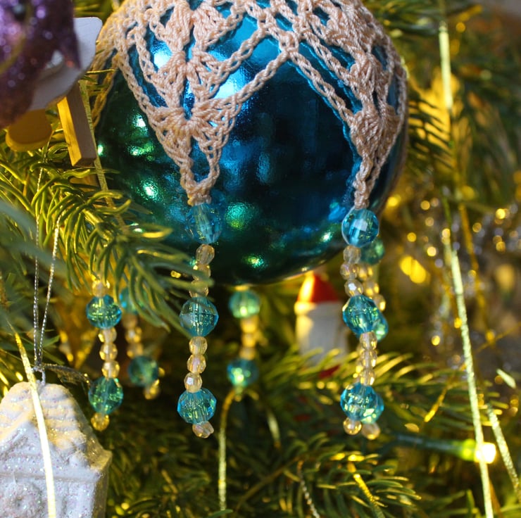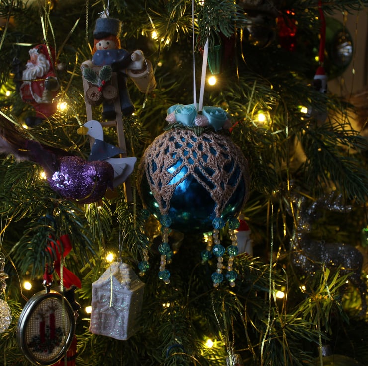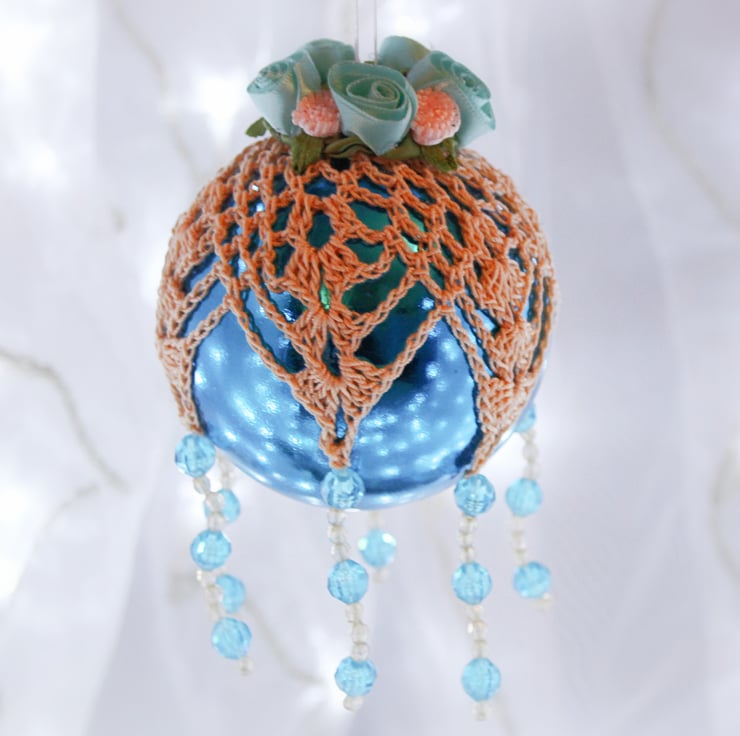 Discover the charm of this exquisite high-gloss turquoise-coloured bauble, beautifully enhanced with intricate hand-crocheted peach lace. Topped with elegant aqua satin roses and peach satin Chrysanthemums, it features vibrant turquoise and peach multi-faceted acrylic beads cascading from the lace points—an enchanting addition to your Christmas tree!