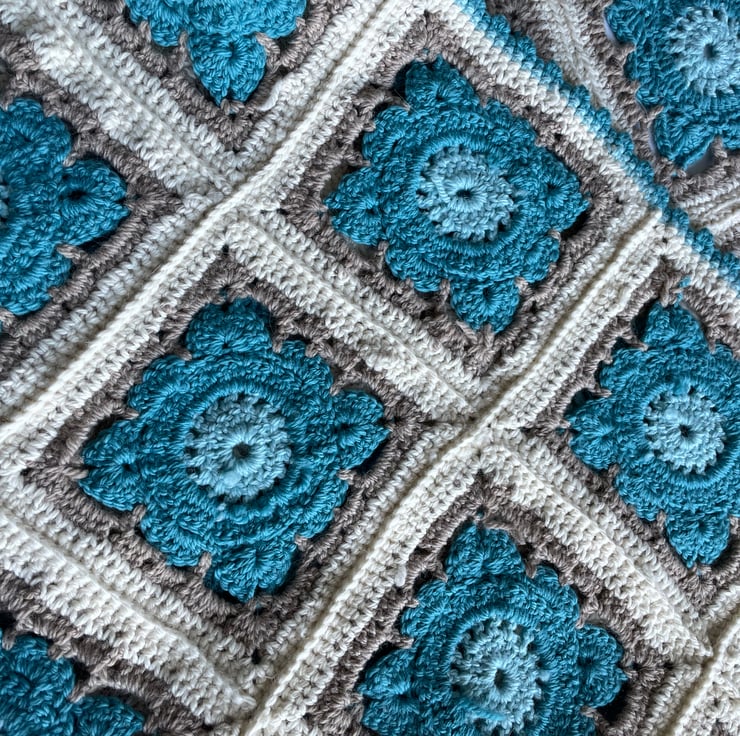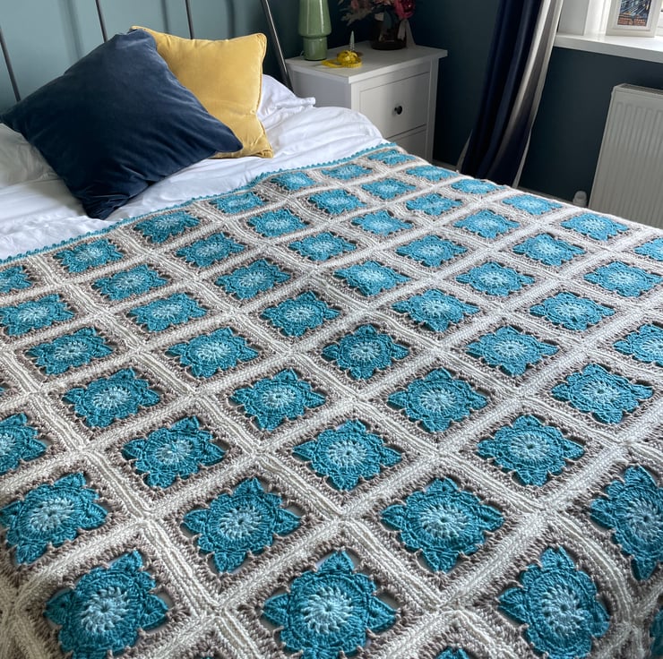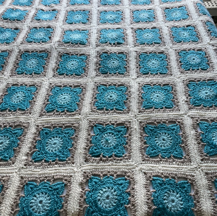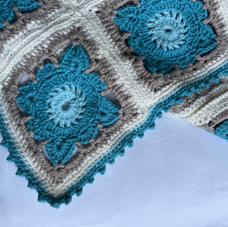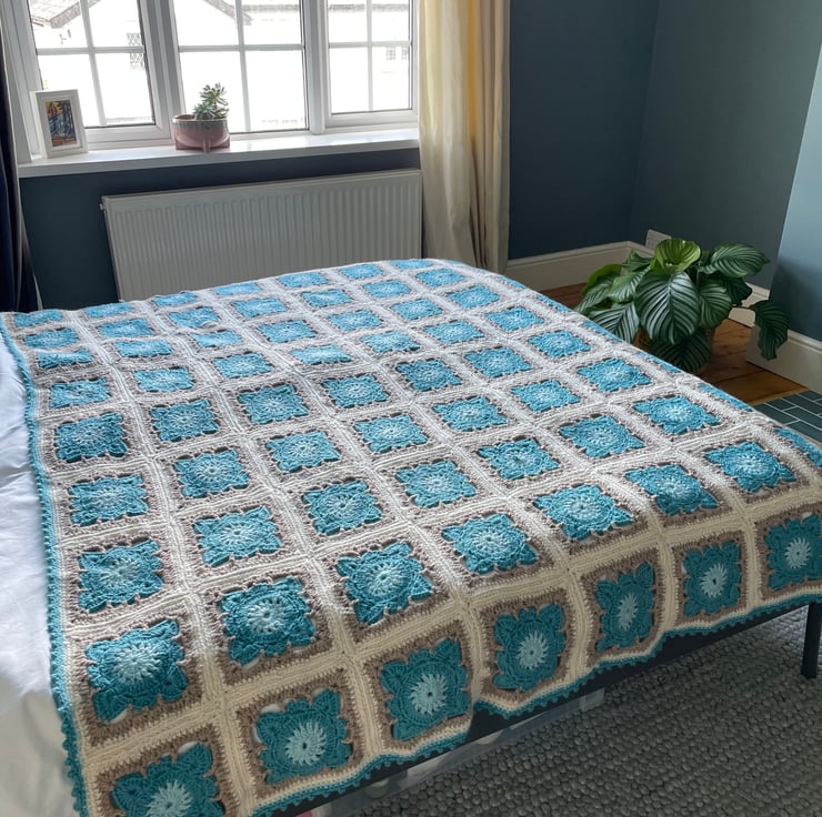 Large handmade crochet blanket in willow pattern granny squares with scalloped trim