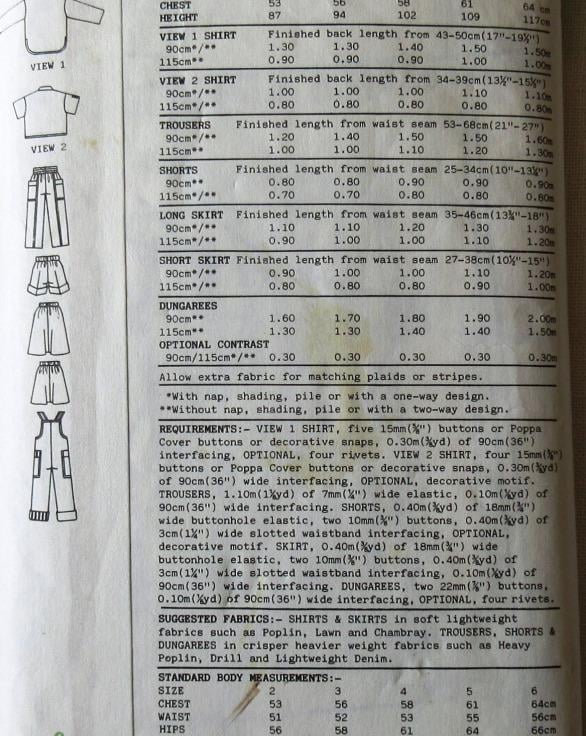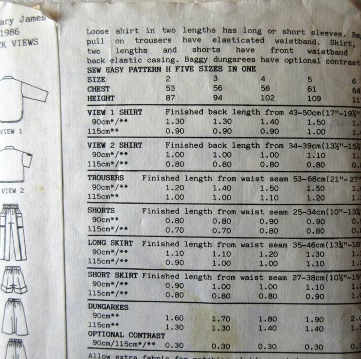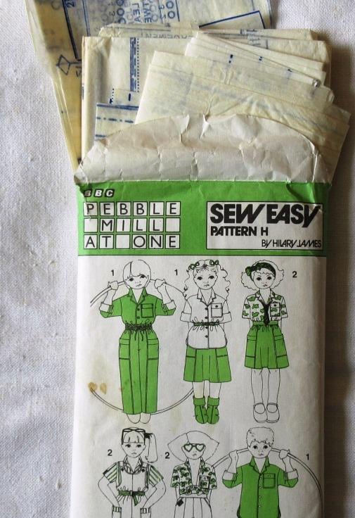A multi-size sewing pattern for a child's wardrobe (shirt, trousers, shorts, skirt, dungarees) in sizes 2 - 6 (chest 21"/53 cm - 25"/64 cm, Pebble Mill at One, Sew Easy Pattern H by Hilary James). The loose shirt in two lengths has long or short sleeves. Baggy pull-on trousers have elasticated waistband. Skirt, in two lengths, and shorts have front waistband and back elastic casing. Baggy dungarees have optional contrast. The pattern has only been used to make the skirt in the biggest size. It is dated 1986.
