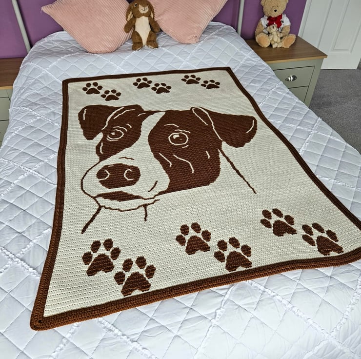 Fur babies need blankets too! This absolutely stunning Jack Russell Terrier blanket was made using 100% acrylic yarn. It measures approximately 138x95 centimetres (54x37 inches) I have photographed it on my double bed to give you an idea of the size. This blanket is machine washable.