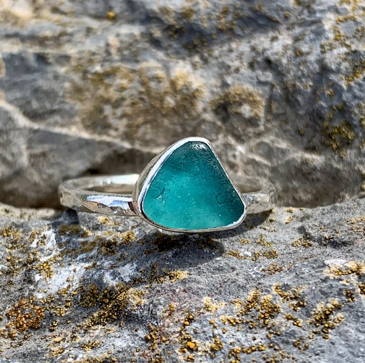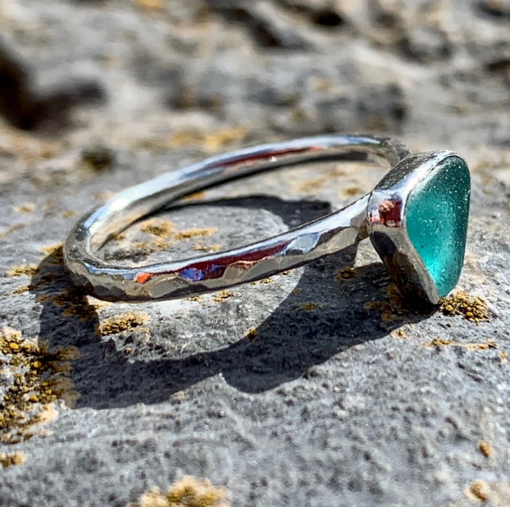 This beautiful piece of aquamarine sea glass was found along the UK's South West coastline and has been set in a fine silver bezel (.999) with a recycled (ecosilver) sterling silver (.925) 2mm round wire ring., which has been hammer textured. This ring has not been hallmarked.