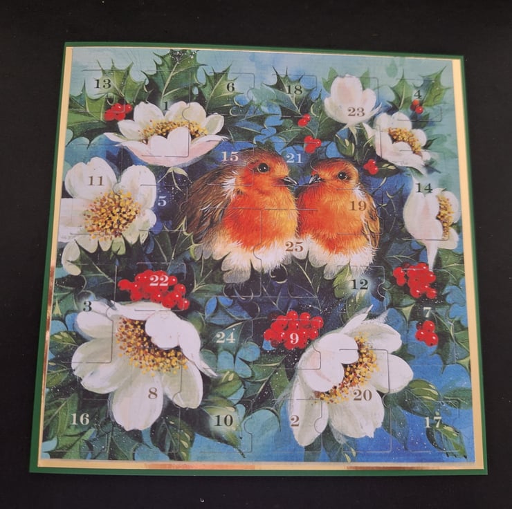 A handmade advent calendar card featuring a pair of robins amid a wreath of holly & Christmas roses. The image contains 25 small windows, with a different picture behind each.