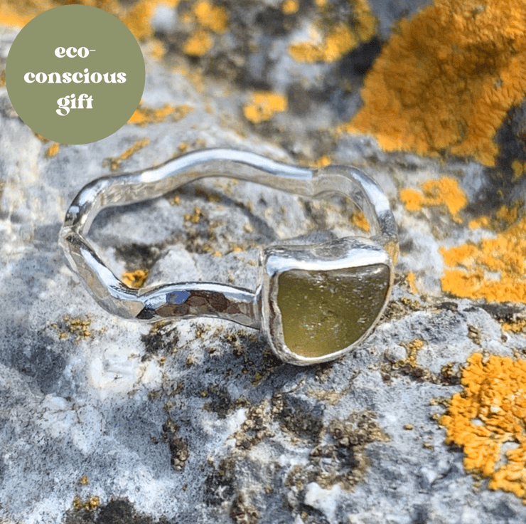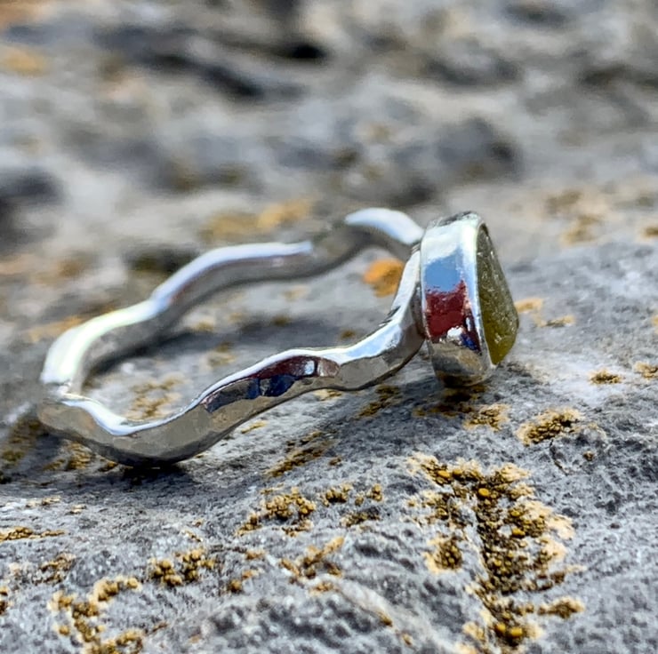 This beautiful rare piece of olive yellow sea glass was found along the UK's South West coastline and has been set in a fine silver bezel (.999) with a recycled (ecosilver) sterling silver (.925) hammer textured ring which has been shaped to form a wave pattern. This ring has not been hallmarked.