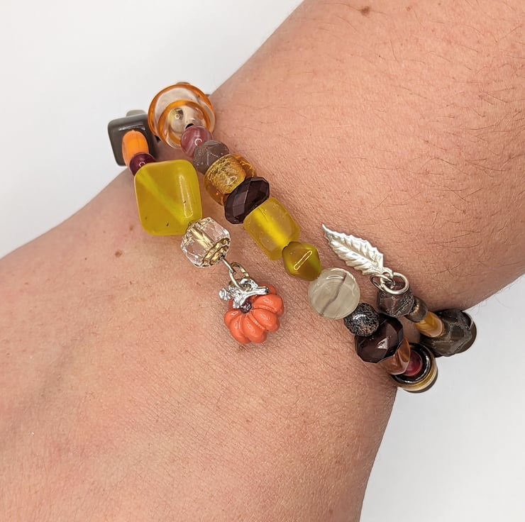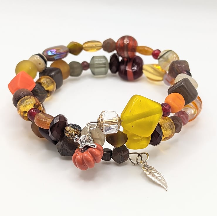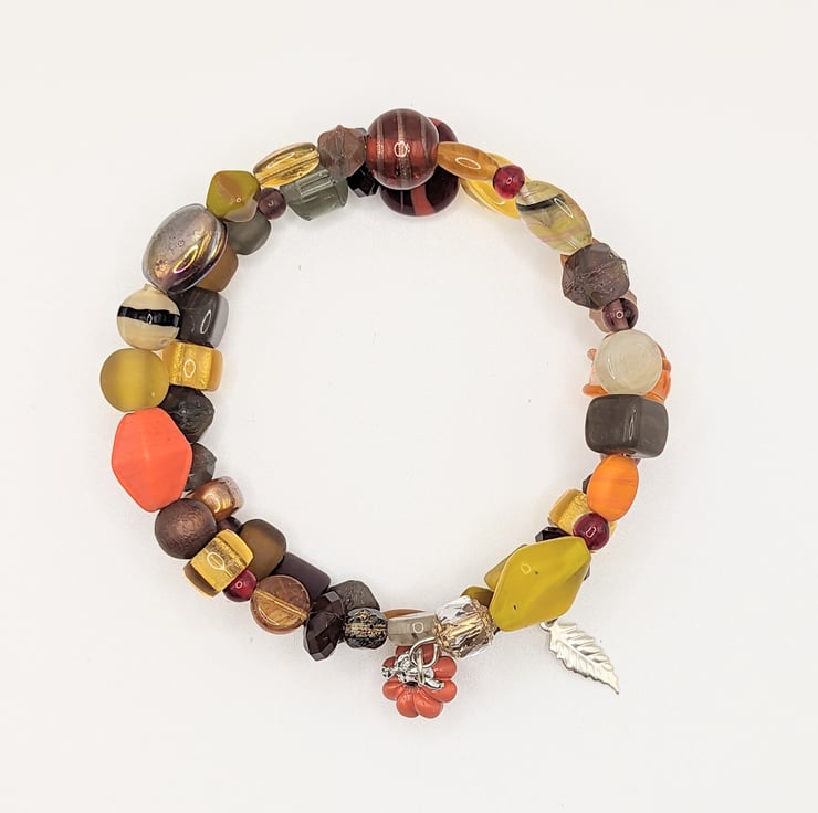 Wrap-around bracelet with autumnal coloured glass beads in all shapes and sizes, finished with a super cute pumpkin charm and tiny leaf.