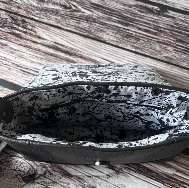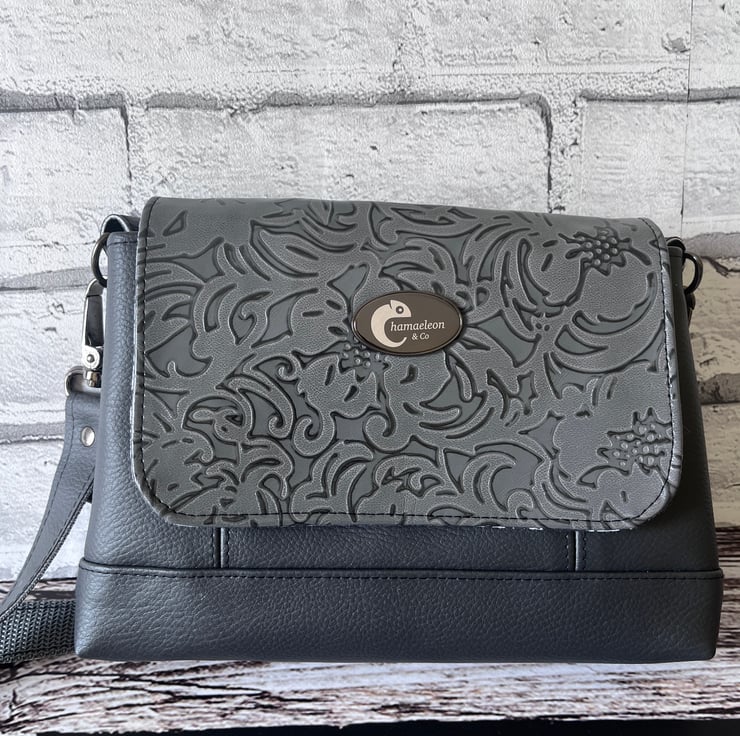Solid grey faux leather with a grey embossed flap for added style. black and white cotton lining with an internal zip for your treasured belongings.
