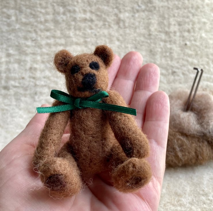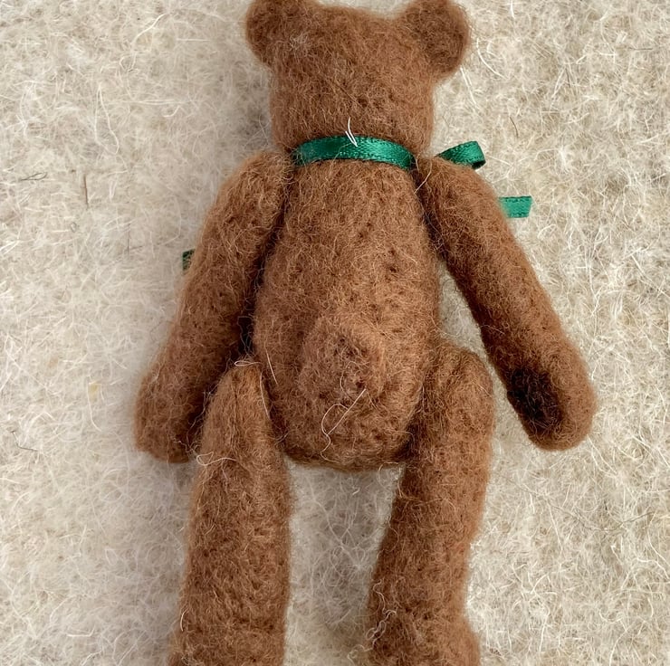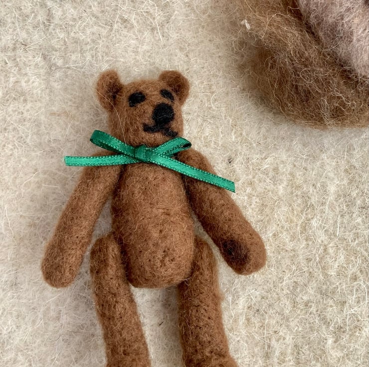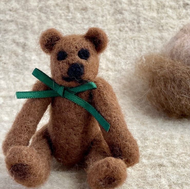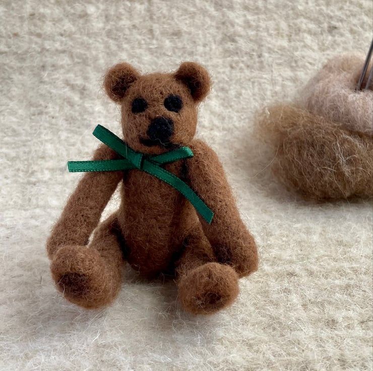 Tiny jointed Teddy Bear. Made entirely from wool and button thread this tiny bear’s arms and legs can be moved. Inspired by the old fashioned jointed Teddies he would be a welcome addition to anyone’s shelf or mantle piece.