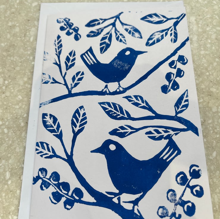 Individual hand printed from Lino cut greetings card. Blank inside for your own message. Each card comes in a cellophane packet with an envelope. Each card is unique, I call it perfectly imperfect, as you never really know how each print will turn out until you lift the card from the lino. £0.50 from each card sale will be donated to Ovacome.