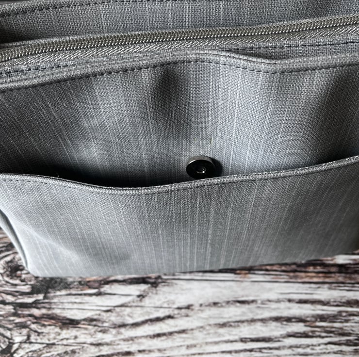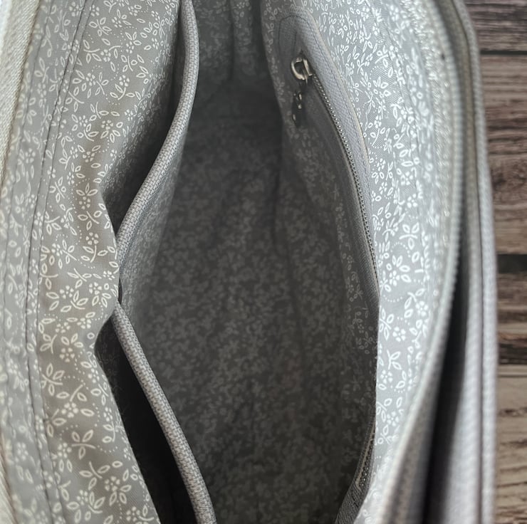 Open the main compartment zipper to reveal a very generous interior with a zipper pocket and two slip pockets trimmed with matching faux leather.