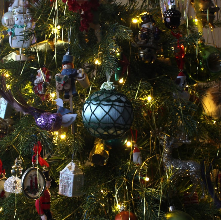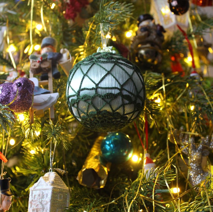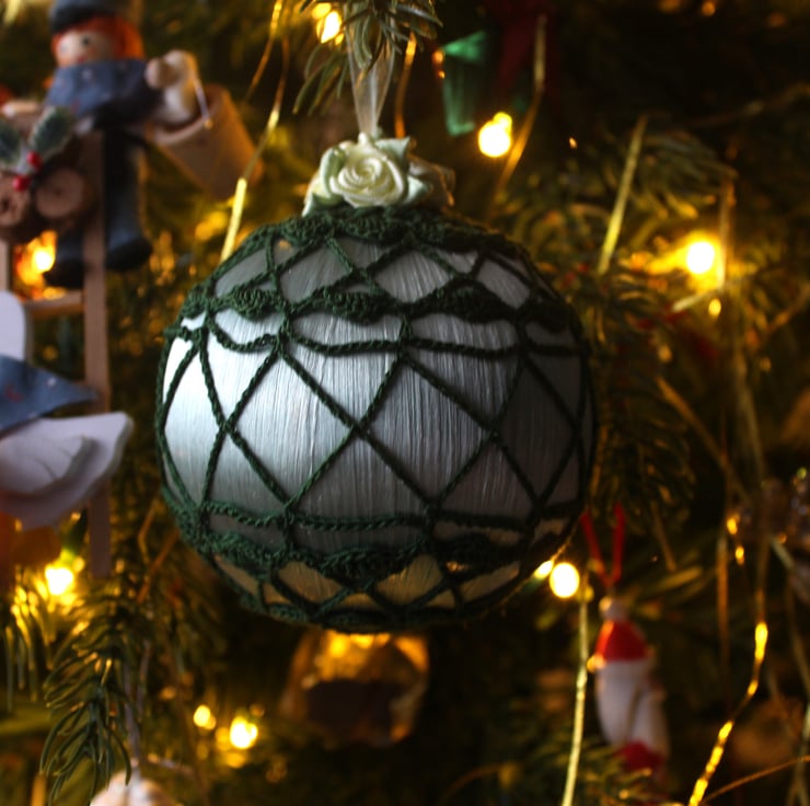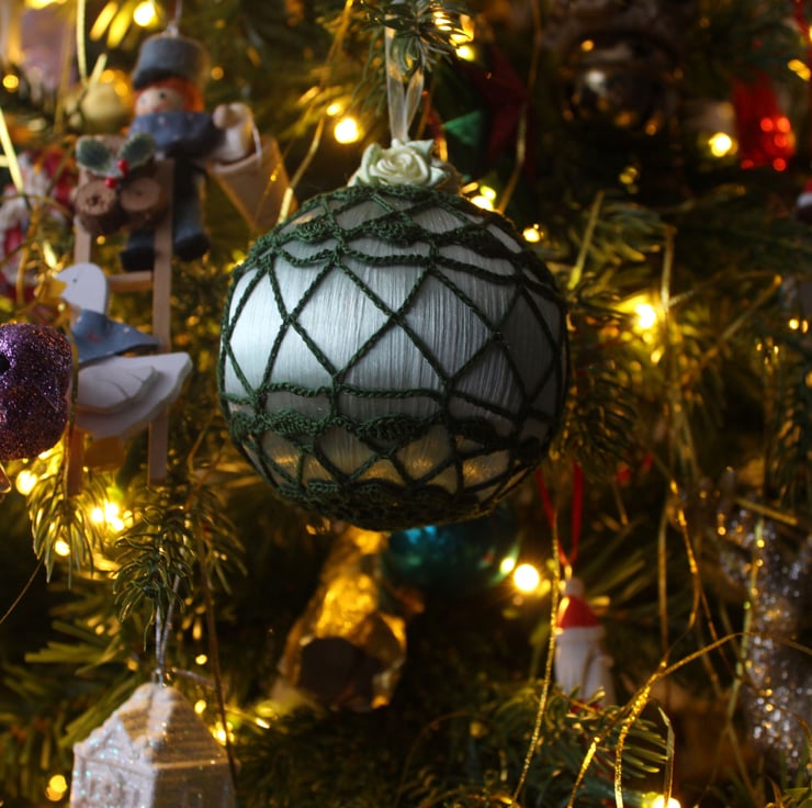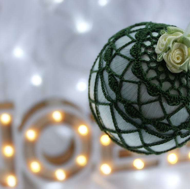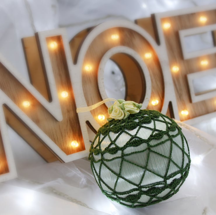 Discover the charm of this exquisite pale green-coloured thread bauble, beautifully enhanced with intricate hand-crocheted dark green lace and topped with elegant yellow satin roses —an enchanting addition to your Christmas tree!